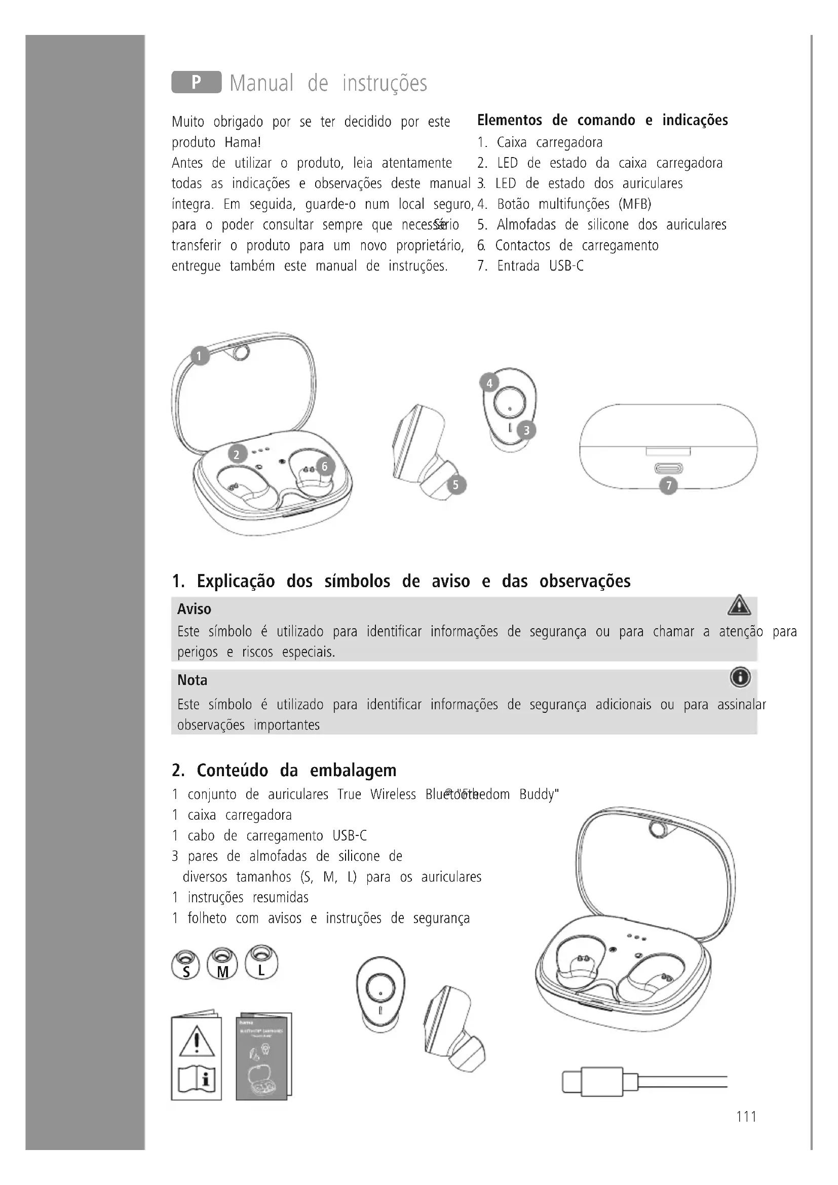 "Freedom Buddy" 1 caixa carregadora 1 cabo de carregamento USB-C 3 pares de almofadas de silicone de diversos tamanhos (S, M, L) para os auriculares 1 instruções resumidas 1 folheto com avisos e instruções de segurança