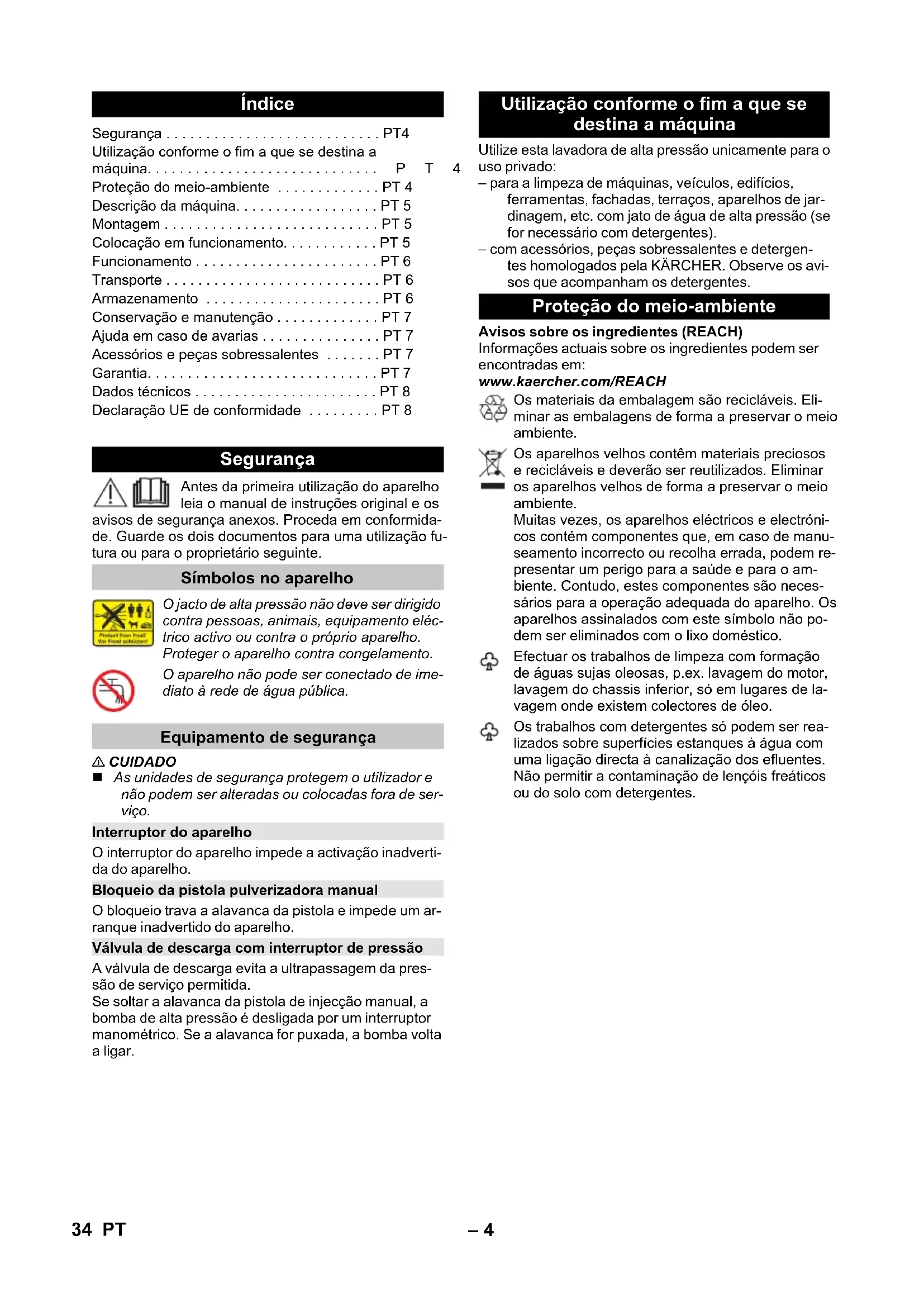 89 dB(A) Sujeto a modificaciones técnicas. Declaración UE de conformidad Producto: Limpiadora a alta presión Modelo: KHP 4 Directivas comunitarias aplicables 2000/14/CE 2014/30/UE 2006/42/CE (+2009/127/CE) 2011/65/UE Normas armonizadas aplicadas EN 50581 EN 55014–1:2017 EN 55014–2: 2015 EN 60335–1 EN 60335–2–79 EN 61000–3–2: 2014 EN 61000–3–3: 2013 EN 62233: 2008 Procedimiento de evaluación de la conformidad aplicado 2000/14/CE: Anexo V Nivel de potencia acústica dB(A) Medido: 87 Garantizado: 89 Winnenden, 2018/08/01 Chairman of the Board of Management Director Regulatory Affairs & Certification 33ES– 4 Antes da primeira utilização do aparelho leia o manual de instruções original e os avisos de segurança anexos. Proceda em conformida- de. Guarde os dois documentos para uma utilização fu- tura ou para o proprietário seguinte. 몇 CUIDADO As unidades de segurança protegem o utilizador e não podem ser alteradas ou colocadas fora de ser- viço. O interruptor do aparelho impede a activação inadverti- da do aparelho. O bloqueio trava a alavanca da pistola e impede um ar- ranque inadvertido do aparelho. A válvula de descarga evita a ultrapassagem da pres- são de serviço permitida. Se soltar a alavanca da pistola de injecção manual, a bomba de alta pressão é desligada por um interruptor manométrico. Se a alavanca for puxada, a bomba volta a ligar. Utilize esta lavadora de alta pressão unicamente para o uso privado: – para a limpeza de máquinas, veículos, edifícios, ferramentas, fachadas, terraços, aparelhos de jar- dinagem, etc. com jato de água de alta pressão (se for necessário com detergentes). – com acessórios, peças sobressalentes e detergen- tes homologados pela KÄRCHER. Observe os avi- sos que acompanham os detergentes. Avisos sobre os ingredientes (REACH) Informações actuais sobre os ingredientes podem ser encontradas em: www.kaercher.com/REACH Índice Segurança . . . . . . . . . . . . . . . . . . . . . . . . . . . PT4 Utilização conforme o fim a que se destina a máquina. . . . . . . . . . . . . . . . . . . . . . . . . . . . .PT4 Proteção do meio-ambiente . . . . . . . . . . . . . PT 4 Descrição da máquina. . . . . . . . . . . . . . . . . . PT 5 Montagem . . . . . . . . . . . . . . . . . . . . . . . . . . . PT 5 Colocação em funcionamento. . . . . . . . . . . . PT 5 Funcionamento . . . . . . . . . . . . . . . . . . . . . . . PT 6 Transporte . . . . . . . . . . . . . . . . . . . . . . . . . . . PT 6 Armazenamento . . . . . . . . . . . . . . . . . . . . . . PT 6 Conservação e manutenção . . . . . . . . . . . . . PT 7 Ajuda em caso de avarias . . . . . . . . . . . . . . . PT 7 Acessórios e peças sobressalentes . . . . . . . PT 7 Garantia. . . . . . . . . . . . . . . . . . . . . . . . . . . . . PT 7 Dados técnicos . . . . . . . . . . . . . . . . . . . . . . . PT 8 Declaração UE de conformidade . . . . . . . . . PT 8 Segurança Símbolos no aparelho O jacto de alta pressão não deve ser dirigido contra pessoas, animais, equipamento eléc- trico activo ou contra o próprio aparelho. Proteger o aparelho contra congelamento. O aparelho não pode ser conectado de ime- diato à rede de água pública. Equipamento de segurança Interruptor do aparelho Bloqueio da pistola pulverizadora manual Válvula de descarga com interruptor de pressão Utilização conforme o fim a que se destina a máquina Proteção do meio-ambiente Os materiais da embalagem são recicláveis. Eli- minar as embalagens de forma a preservar o meio ambiente. Os aparelhos velhos contêm materiais preciosos e recicláveis e deverão ser reutilizados. Eliminar os aparelhos velhos de forma a preservar o meio ambiente. Muitas vezes, os aparelhos eléctricos e electróni- cos contém componentes que, em caso de manu- seamento incorrecto ou recolha errada, podem re- presentar um perigo para a saúde e para o am- biente. Contudo, estes componentes são neces- sários para a operação adequada do aparelho. Os aparelhos assinalados com este símbolo não po- dem ser eliminados com o lixo doméstico. Efectuar os trabalhos de limpeza com formação de águas sujas oleosas, p.ex. lavagem do motor, lavagem do chassis inferior, só em lugares de la- vagem onde existem colectores de óleo. Os trabalhos com detergentes só podem ser rea- lizados sobre superfícies estanques à água com uma ligação directa à canalização dos efluentes. Não permitir a contaminação de lençóis freáticos ou do solo com detergentes. 34 PT– 5 O volume de fornecimento do aparelho (conforme o modelo) é ilustrado na embalagem. Este manual de ins- truções descreve todas as opções possíveis. Figuras veja página 2 1 Peça de acoplamento para ligação da água 2 Conexão de água com peneira incorporada 3 Interruptor do aparelho "0/OFF" / "I/ON" 4 Mangueira de alta pressão 5 Tambor da pistola pulverizadora manual 6 Local de armazenamento da pistola pulverizadora manual 7 Alça de transporte 8 Manivela para o carretel de mangueiras 9 Rede para compartimento dos acessórios 10 Cabo de ligação à rede com ficha de rede 11 Reservatório de detergente 12 Roda de transporte 13 Pistola de injecção manual 14 Bloqueio da pistola pulverizadora manual 15 Botão para separar a mangueira de alta pressão da pistola pulverizadora manual 16 Tubo de jacto com fresadora de sujidade Para sujidade persistente 17 Lança com regulação da pressão (Vario Power) Para os trabalhos de limpeza mais frequentes É possível aumentar a pressão de trabalho conti- nuamente de “SOFT” até “HARD”. Para ajustar a pressão de trabalho, soltar a alavanca da pistola de alta pressão e rodar a lança para a posição de- sejada. Adequado para trabalhos com detergente. Montar os componentes soltos na embalagem no apa- relho, antes de proceder à colocação em funcionamen- to. Figuras, ver página 3 Figura Encaixar as rodas. Fixar as rodas com os tampões fornecidos. Ter atenção ao alinhamento