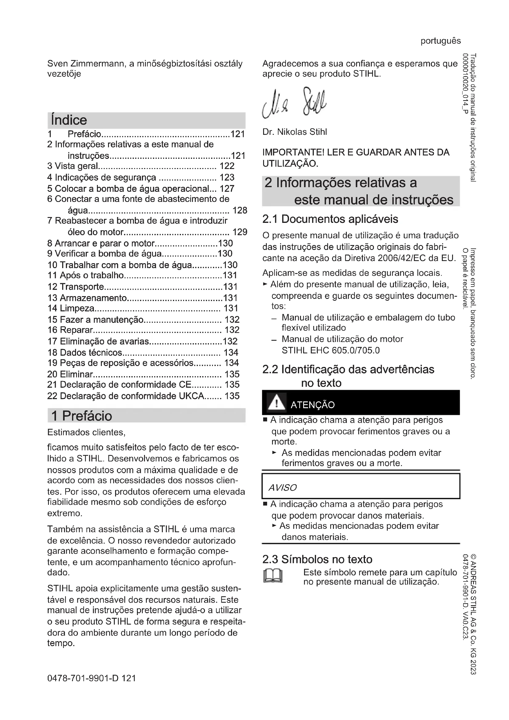 - 22 Declaração de conformidade UKCA 1 Prefácio Estimados clientes, ficamos muito satisfeitos pelo facto de ter esco‐ lhido a STIHL. Desenvolvemos e fabricamos os nossos produtos com a máxima qualidade e de acordo com as necessidades dos nossos clien‐ tes. Por isso, os produtos oferecem uma elevada fiabilidade mesmo sob condições de esforço extremo. Também na assistência a STIHL é uma marca de excelência. O nosso revendedor autorizado garante aconselhamento e formação compe‐ tente, e um acompanhamento técnico aprofun‐ dado. STIHL apoia explicitamente uma gestão susten‐ tável e responsável dos recursos naturais. Este manual de instruções pretende ajudá-o a utilizar o seu produto STIHL de forma segura e respeita‐ dora do ambiente durante um longo período de tempo. Agradecemos a sua confiança e esperamos que aprecie o seu produto STIHL. Dr. Nikolas Stihl p. 135