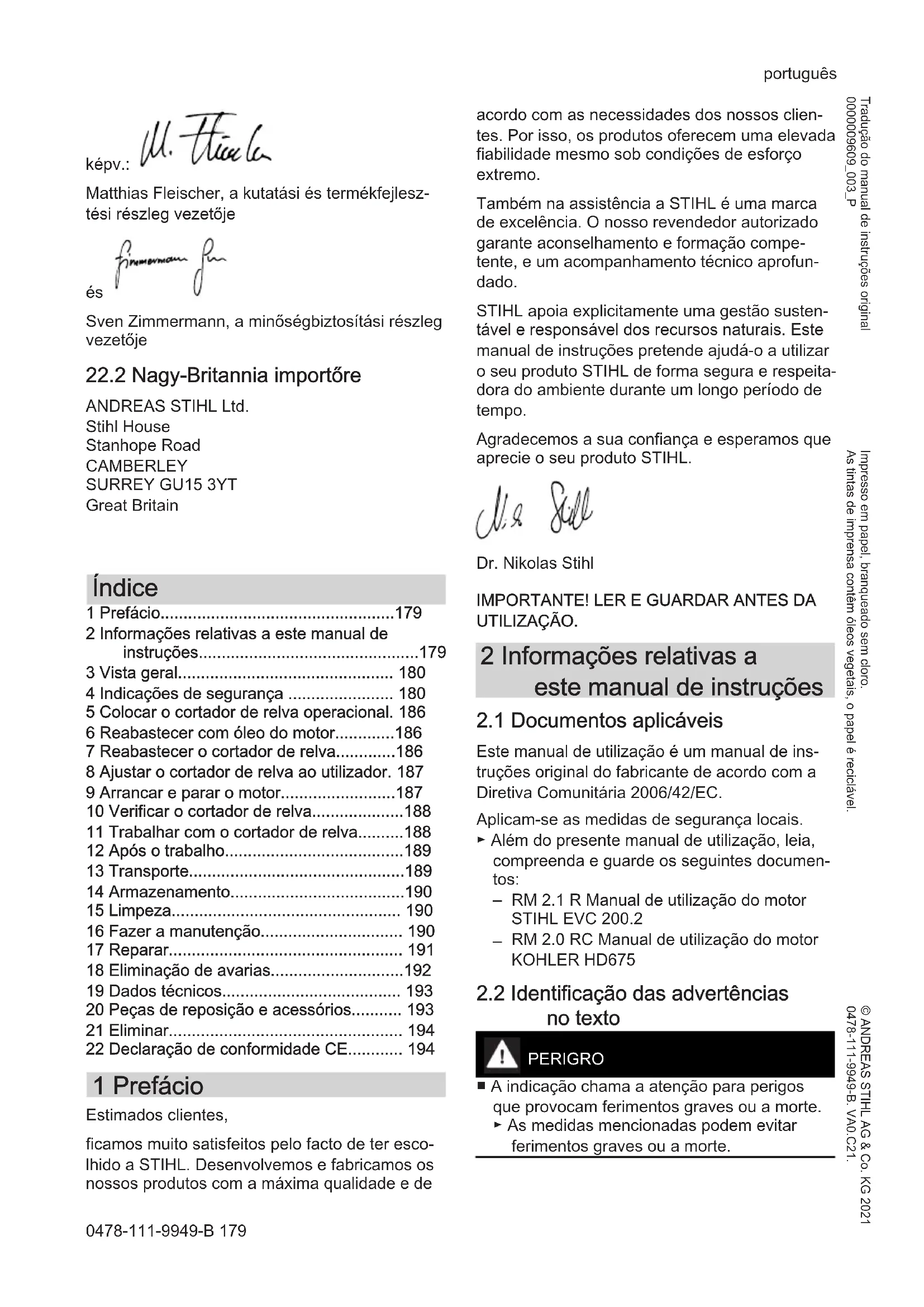 - 22 Declaração de conformidade CE 1 Prefácio Estimados clientes, ficamos muito satisfeitos pelo facto de ter esco‐ lhido a STIHL. Desenvolvemos e fabricamos os nossos produtos com a máxima qualidade e de acordo com as necessidades dos nossos clien‐ tes. Por isso, os produtos oferecem uma elevada fiabilidade mesmo sob condições de esforço extremo. Também na assistência a STIHL é uma marca de excelência. O nosso revendedor autorizado garante aconselhamento e formação compe‐ tente, e um acompanhamento técnico aprofun‐ dado. STIHL apoia explicitamente uma gestão susten‐ tável e responsável dos recursos naturais. Este manual de instruções pretende ajudá-o a utilizar o seu produto STIHL de forma segura e respeita‐ dora do ambiente durante um longo período de tempo. Agradecemos a sua confiança e esperamos que aprecie o seu produto STIHL. Dr. Nikolas Stihl p. 194