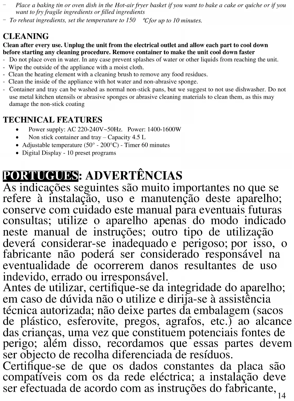 durante 10 minutos. LIMPEZA Limpe após cada utilização. Desligue a unidade da tomada eléctrica e deixe que cada peça arrefeça antes de iniciar qualquer procedimento de limpeza. Remova o recipiente para fazer a unidade arrefecer mais rapidamente - Não coloque o forno na água. Evite o contacto de salpicos de água ou outros líquidos com a unidade. - Limpe a parte externa do aparelho com um pano húmido. - Limpe o elemento de aquecimento com uma escova de limpeza para remover qualquer resíduo de comida. - Limpe o interior do aparelho com água quente e esponja não abrasiva. - O recipiente e a bandeja podem ser lavados normalmente como panelas anti-aderentes, mas sugerimos não lavar na máquina de lavar louça. Não use utensílios de cozinha de metal ou esponjas abrasivas ou materiais de limpeza abrasivos para limpeza, pois isso pode danificar o revestimento anti-aderente