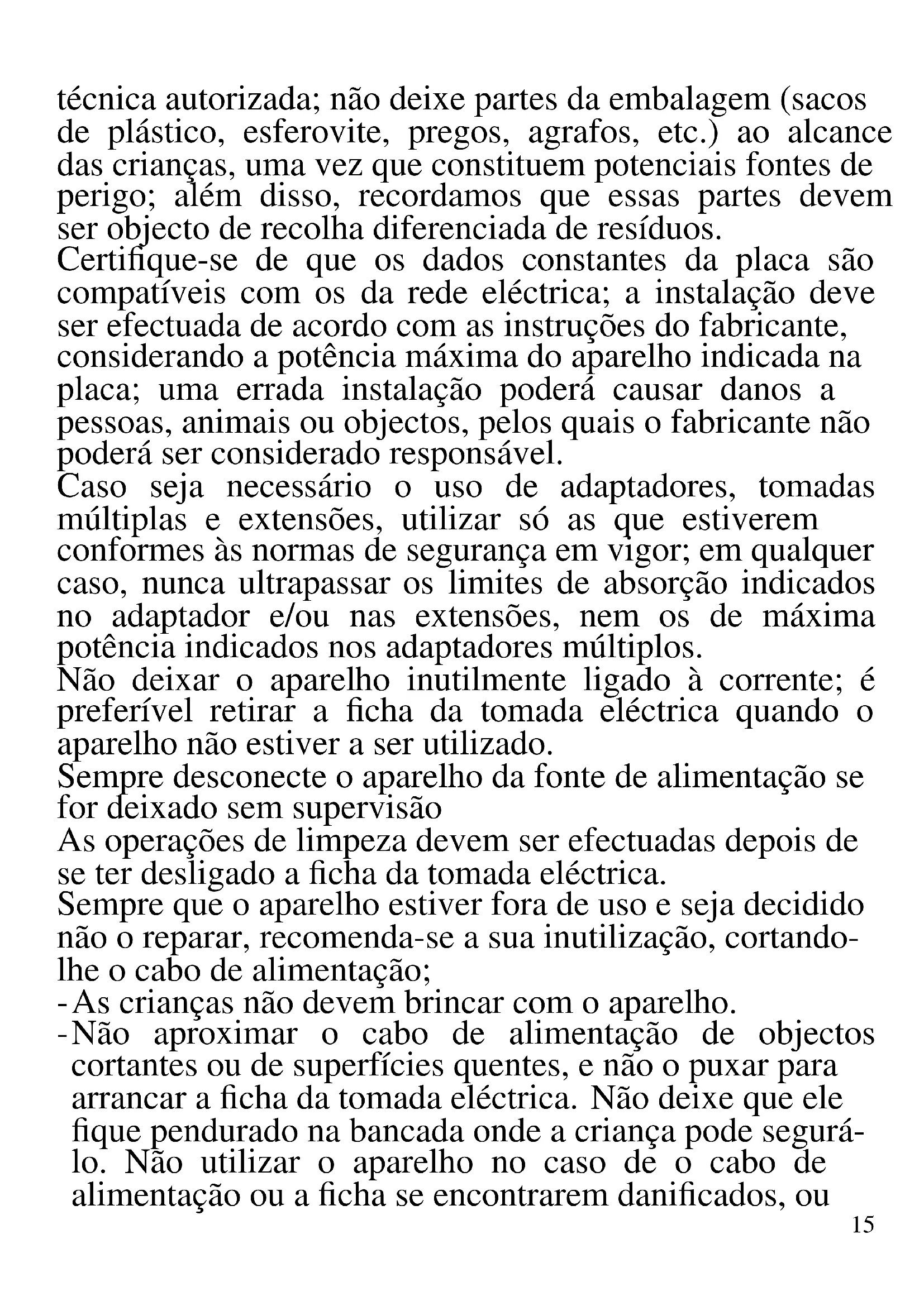 As indicações seguintes são muito importantes no que se refere à instalação, uso e manutenção deste aparelho; conserve com cuidado este manual para eventuais futuras consultas; utilize o aparelho apenas do modo indicado neste manual de instruções; outro tipo de utilização deverá considerar-se inadequado e perigoso; por isso, o fabricante não poderá ser considerado responsável na eventualidade de ocorrerem danos resultantes de uso indevido, errado ou irresponsável. Antes de utilizar, certifique-se da integridade do aparelho; em caso de dúvida não o utilize e dirija-se à assistência15 técnica autorizada; não deixe partes da embalagem (sacos de plástico, esferovite, pregos, agrafos, etc.) ao alcance das crianças, uma vez que constituem potenciais fontes de perigo; além disso, recordamos que essas partes devem ser objecto de recolha diferenciada de resíduos. Certifique-se de que os dados constantes da placa são compatíveis com os da rede eléctrica; a instalação deve ser efectuada de acordo com as instruções do fabricante, considerando a potência máxima do aparelho indicada na placa; uma errada instalação poderá causar danos a pessoas, animais ou objectos, pelos quais o fabricante não poderá ser considerado responsável. Caso seja necessário o uso de adaptadores, tomadas múltiplas e extensões, utilizar só as que estiverem conformes às normas de segurança em vigor; em qualquer caso, nunca ultrapassar os limites de absorção indicados no adaptador e/ou nas extensões, nem os de máxima potência indicados nos adaptadores múltiplos. Não deixar o aparelho inutilmente ligado à corrente; é preferível retirar a ficha da tomada eléctrica quando o aparelho não estiver a ser utilizado. Sempre desconecte o aparelho da fonte de alimentação se for deixado sem supervisão As operações de limpeza devem ser efectuadas depois de se ter desligado a ficha da tomada eléctrica. Sempre que o aparelho estiver fora de uso e seja decidido não o reparar, recomenda-se a sua inutilização, cortando- lhe o cabo de alimentação; - As crianças não devem brincar com o aparelho. - Não aproximar o cabo de alimentação de objectos cortantes ou de superfícies quentes, e não o puxar para arrancar a ficha da tomada eléctrica. Não deixe que ele fique pendurado na bancada onde a criança pode segurá- lo. Não utilizar o aparelho no caso de o cabo de alimentação ou a ficha se encontrarem danificados, ou16 em caso de curto-circuitos; Nessa eventualidade, leve o aparelho a um centro de assistência autorizado. - Não expor o aparelho a condições atmosféricas adversas, como chuva, humidade, gelo. Conserve em lugar seco. - Não manusear ou tocar o aparelho com as mãos molhadas ou os pés descalços. - Este aparelho pode ser utilizado por crianças com mais de 8 anos e por pessoas com reduzida capacidade física, sensorial ou mental, ou ainda com falta de experiência na sua utilização, desde que lhes seja assegurada uma adequada supervisão ou se tiverem sido instruídas no uso do aparelho em segurança; as operações de limpeza e de manutenção não devem ser efectuadas por crianças, a menos que tenham mais de 8 anos e sejam supervisionadas. - Mantenha o aparelho e o cabo de alimentação fora do alcance de crianças com menos de 8 anos de idade. Se o cabo de alimentação estiver danificado, ou em caso de falha e / ou avaria, não mexa no aparelho. Qualquer reparação deve ser realizada pelo fabricante ou pelo seu serviço de assistência técnica ou, em qualquer caso, por uma pessoa com qualificação semelhante, a fim de evitar qualquer risco. O não cumprimento dos itens acima pode comprometer a segurança do equipamento e invalidar os termos da garantia. ATENÇÃO: este aparelho inclui uma função de aquecimento. Algumas superfícies, mesmo que não a placa propriamente dita, poderão atingir temperaturas elevadas. Uma vez que a sensibilidade à temperatura difere de pessoa para pessoa, este aparelho deverá ser usado com CUIDADO. Coloque o aparelho exclusivamente sobre superfícies com aderência e preparadas para o efeito, - Este aparelho foi concebido para uso doméstico ou equivalente, em situações como as de refeitórios em17 pequenas empresas ou outros ambientes de natureza laboral; por clientes de hotéis, motéis ou acomodação turística, como turismo rural ou residencial. - Antes de cada utilização, soltar o cabo de alimentação. - Este aparelho não foi concebido para ser utilizado por intermédio de um temporizador externo ou de um sistema de comando à distância autónomo. - Utilizar somente acessórios e componentes originais. - Manter o aparelho afastado de materiais inflamáveis, fontes de calor, zonas frias e vapor. Não sujeite produto a impactos, pois isso pode danificá-lo