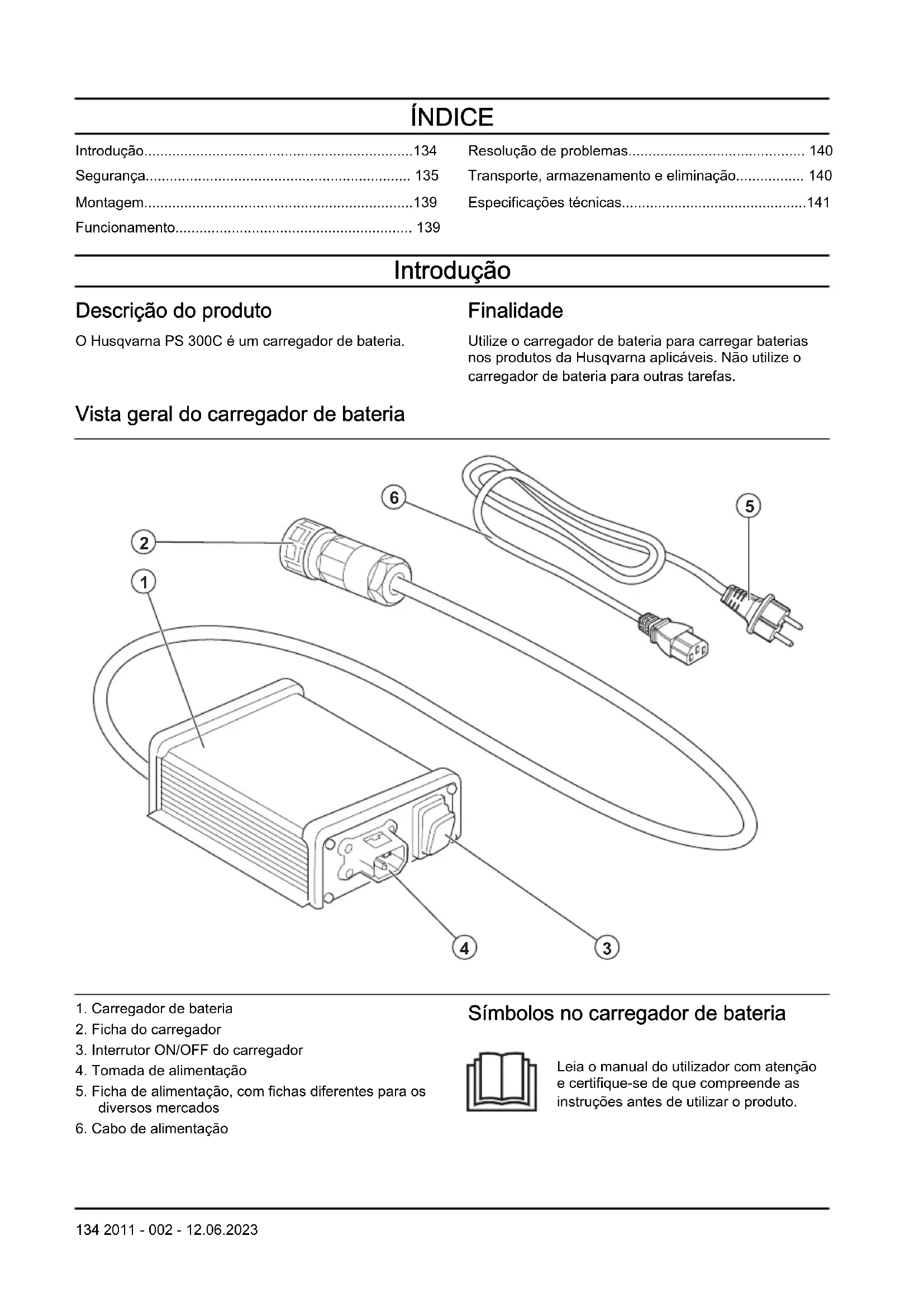 Símbolos no carregador de bateria Leia o manual do utilizador com atenção e certifique-se de que compreende as instruções antes de utilizar o produto. 134 2011 - 002 - 12.06.2023O carregador de bateria está em conformidade com as diretivas CE aplicáveis. Este carregador de bateria está em conformidade com os regulamento aplicáveis do Reino Unido. IP54 – O carregador de bateria tem proteção contra poeiras e salpicos de água. O carregador de bateria ou a respetiva embalagem não são resíduos domésticos. Recicle-os numa localização de eliminação aplicável para equipamentos elétricos e eletrónicos. Código para leitura. Nota: Os restantes símbolos/autocolantes existentes no carregador de bateria dizem respeito a requisitos para homologação em algumas áreas comerciais. Segurança Definições de segurança Os avisos, as precauções e as notas são utilizados para indicar partes especialmente importantes do manual. ATENÇÃO: Utilizado no caso de existir risco de ferimento ou morte para o utilizador ou transeuntes, se não forem respeitadas as instruções do manual. CUIDADO: Utilizado se existir risco de danos para o produto, para outros materiais ou para a área adjacente, se não forem respeitadas as instruções do manual. Nota: Utilizado para disponibilizar informações adicionais necessárias numa determinada situação. Instruções de segurança importantes ATENÇÃO: Leia todos os avisos de segurança e todas as instruções. O incumprimento dos avisos e das instruções poderá resultar em choques elétricos, incêndios e/ou ferimentos graves. Nota: Guarde todas as instruções e avisos.