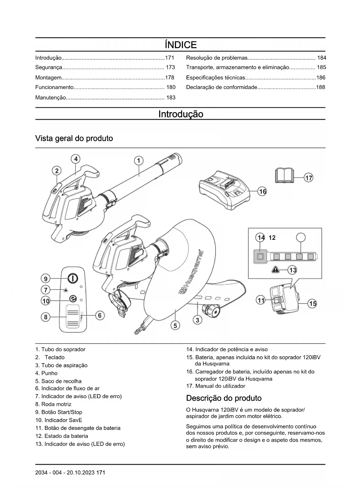 Descrição do produto O Husqvarna 120iBV é um modelo de soprador/ aspirador de jardim com motor elétrico. Seguimos uma política de desenvolvimento contínuo dos nossos produtos e, por conseguinte, reservamo-nos o direito de modificar o design e o aspeto dos mesmos, sem aviso prévio. 2034 - 004 - 20.10.2023 171Finalidade Modo de sopro: O soprador foi concebido para soprar partículas de sujidade ou aparas de relva e afastá- las de caminhos, acessos, pátios, etc. Foi também concebido para soprar aparas de relva, palha ou folhas de forma a criar pilhas ou para remover as partículas de sujidade em cantos, juntas ou folgas entre azulejos ou tijolos. Modo de aspiração: O aspirador foi concebido para aspirar materiais secos. Estes incluem folhas, relva, pequenos ramos e pedaços de papel. Símbolos no produto AVISO: Este produto pode ser perigoso e provocar ferimentos graves ou a morte do operador ou de terceiros. Seja cuidadoso e utilize o produto corretamente. Leia o manual do utilizador com atenção e certifique-se de que compreende as instruções antes de utilizar este produto. Utilize proteção ocular aprovada. Tensão nominal, V Corrente contínua. Emissão de ruído para a etiqueta ambiental de acordo com as diretivas e regulamentos da União Europeia e do Reino Unido e o regulamento "Protection of the Environment Operations (Noise Control) Regulation 2017" (regulamento de proteção de operações no meio ambiente [controlo do ruído] de 2017) da Nova Gales do Sul. O nível de potência sonora garantido do produto está especificado nas Especificações técnicas na página 186 e na etiqueta. Desligue a bateria antes da manutenção. O produto ou a respetiva embalagem não são resíduos domésticos. Recicle o equipamento numa estação de reciclagem para equipamentos elétricos e eletrónicos. O produto está em conformidade com as diretivas CE aplicáveis. Este produto está em conformidade com os regulamento aplicáveis do Reino Unido. Não exponha à chuva. Aguarde até que as lâmi- nas do rotor parem depois de desligar o produto. Utilize o produto no mo- do de aspiração apenas quando o tubo estiver completamente montado. O utilizador do soprador tem de se certificar de que não se encontra qualquer pessoa ou animal num raio de 15metros. Se trabalharem vários utilizadores simultaneamente na mes- ma área, deve existir uma distância de segurança de, pelo menos, 15me- tros. O soprador pode arremessar vi- olentamente objetos que podem fazer ricochete. Isso pode levar a graves lesões nos olhos no caso do equi- pamento de segurança recomendado não ser usado. aaaa ssxxxxx A etiqueta de tipo apresenta o núme- ro de série. aaaa é o ano de fabrico,
