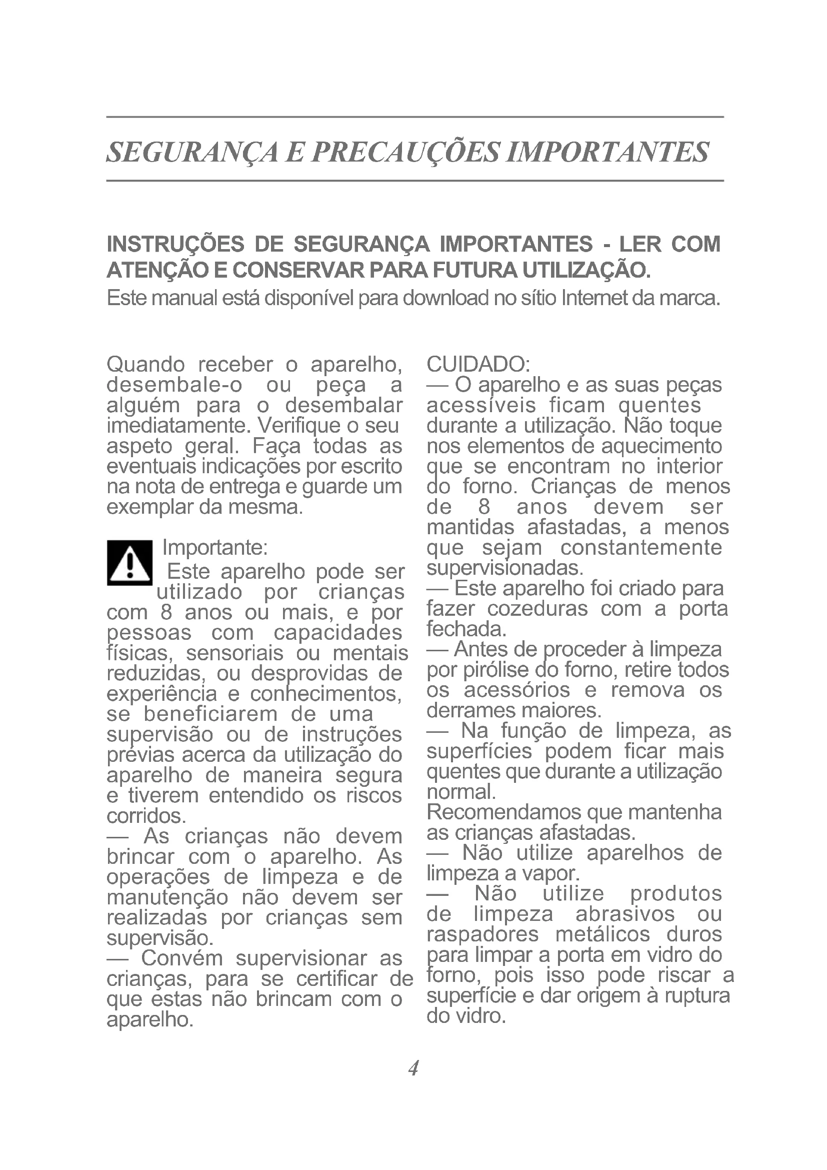 Quando receber o aparelho, desembale-o ou peça a alguém para o desembalar imediatamente. Verifique o seu aspeto geral. Faça todas as eventuais indicações por escrito na nota de entrega e guarde um exemplar da mesma. Importante: Este aparelho pode ser utilizado por crianças com 8 anos ou mais, e por pessoas com capacidades físicas, sensoriais ou mentais reduzidas, ou desprovidas de experiência e conhecimentos, se beneficiarem de uma supervisão ou de instruções prévias acerca da utilização do aparelho de maneira segura e tiverem entendido os riscos corridos. — As crianças não devem brincar com o aparelho. As operações de limpeza e de manutenção não devem ser realizadas por crianças sem supervisão. — Convém supervisionar as crianças, para se certificar de que estas não brincam com o aparelho. CUIDADO: — O aparelho e as suas peças acessíveis ficam quentes durante a utilização. Não toque nos elementos de aquecimento que se encontram no interior do forno. Crianças de menos de 8 anos devem ser mantidas afastadas, a menos que sejam constantemente supervisionadas. — Este aparelho foi criado para fazer cozeduras com a porta fechada. — Antes de proceder à limpeza por pirólise do forno, retire todos os acessórios e remova os derrames maiores. — Na função de limpeza, as superfícies podem ficar mais quentes que durante a utilização normal. Recomendamos que mantenha as crianças afastadas. — Não utilize aparelhos de limpeza a vapor. — Não utilize produtos de limpeza abrasivos ou raspadores metálicos duros para limpar a porta em vidro do forno, pois isso pode riscar a superfície e dar origem à ruptura do vidro. INSTRUÇÕES DE SEGURANÇA IMPORTANTES - LER COM ATENÇÃO E CONSERVAR PARA FUTURA UTILIZAÇÃO. Este manual está disponível para download no sítio Internet da marca.5 ADVERTÊNCIA : Certifique-se de que o aparelho está desligado da alimentação antes de substituir a lâmpada, para evitar qualquer risco de choques eléctricos. Intervenha quando o aparelho estiver frio. Para desapertar a tampa e a lâmpada, utilize uma luva de borracha para facilitar a desmontagem. A ficha da tomada de corrente deve estar acessível após a instalação. Deve ser possível se desconectar da rede ou utilizar uma folha de fazer atual, ou pela incorporação de um interruptor nas canalizações fixas, de acordo com as regras de instalação. — Se o cabo da alimentação ficar danificado, deverá ser substituído pelo fabricante, o serviço pós-venda, ou uma pessoa igualmente habilitada, de modo a evitar qualquer perigo. — Este aparelho pode ser instalado numa bancada ou em coluna, conforme indicado no esquema de instalação. — Centre o forno no móvel, de modo a garantir uma distância mínima de 10 mm com o móvel ao lado. O material do móvel de encastramento deve resistir ao calor (ou estar revestido com um material resistente ao calor). Para mais estabilidade, fixe o forno no móvel com 2 parafusos, através dos orifícios previstos para o efeito. — O aparelho não deve ser instalado atrás de uma porta decorativa, para evitar o seu superaquecimento. — Este aparelho destina-se a ser utilizado em aplicações domésticas e análogas, tais como: áreas de cozinha reservadas ao pessoal de lojas, escritórios e outros ambientes profissionais; quintas; utilização por clientes de hotéis, motéis e outros ambientes de carácter residencial; em ambientes do tipo quarto de hotel. — Para qualquer intervenção de limpeza na cavidade do forno, este deverá estar desligado. Não deve modificar as características do aparelho, pois isto representa um perigo para si. Não utilize o seu forno para guardar comida ou quaisquer outros elementos após a utilização.