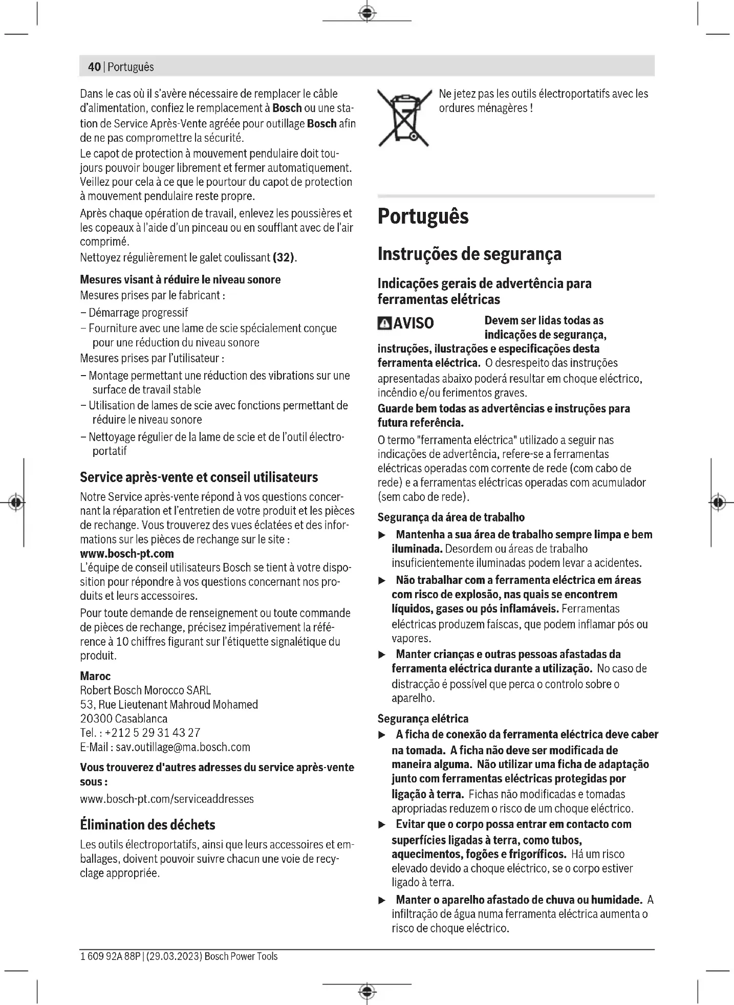 – Fixe os pés da ferramenta elétrica com grampos convencionais à superfície de trabalho. Montagem numa mesa de trabalho Bosch As mesas de trabalho GTA da Bosch oferecem firmeza à ferramenta elétrica, sobre qualquer solo, devido aos pés de altura ajustável. As mesas de trabalho possuem bases de apoio para o apoio de peças longas. u Ler todas as indicações de aviso e instruções fornecidas com a mesa de trabalho. O desrespeito das indicações de aviso e das instruções pode causar choque elétrico, queimaduras e/ou ferimentos graves. u Montar corretamente a mesa de trabalho, antes de montar a ferramenta elétrica. É importante que a montagem seja perfeita, para evitar o risco de desmoronamento. – Monte a ferramenta elétrica na posição de transporte sobre a mesa de trabalho. Instalação flexível (não recomendada!) (ver figura B3) Se excecionalmente não for possível montar a ferramenta elétrica sobre uma superfície de trabalho plana e estável, pode usar como auxiliar uma proteção contra tombamento. u Sem a proteção contra tombamento a ferramenta elétrica não está segura e pode tombar especialmente ao serrar ângulos de meia-esquadria máximos horizontais e/ou verticais. – Rodar a proteção contra tombamento (31) para dentro ou para fora até que a ferramenta elétrica fique direita sobre a superfície de trabalho. Aspiração de pó/de aparas Pós de materiais como por exemplo, tintas que contém chumbo, alguns tipos de madeira, minerais e metais, podem ser nocivos à saúde. O contacto ou a inalação dos pós pode provocar reações alérgicas e/ou doenças nas vias respiratórias do utilizador ou das pessoas que se encontrem por perto. Certos pós, como por exemplo pó de carvalho e faia são considerados como sendo cancerígenos, especialmente quando juntos com substâncias para o tratamento de madeiras (cromato, produtos de proteção da madeira). Material que contém asbesto só deve ser processado por pessoal especializado. – Se possível deverá usar um dispositivo de aspiração de pó apropriado para o material. – Assegurar uma boa ventilação do local de trabalho. – É recomendável usar uma máscara de proteção respiratória com filtro da classe P2. Observe as diretivas para os materiais a serem processados, vigentes no seu país. u Evite a acumulação de pó no local de trabalho. Pós podem entrar levemente em ignição. A aspiração de pó/de aparas pode ser bloqueada por pó, aparas ou por estilhaços da peça a ser trabalhada. – Desligue a ferramenta elétrica e retire a ficha de rede da tomada. – Aguarde até que o disco de serra esteja completamente parado. – Verifique a causa do bloqueio e elimine-a. 1 609 92A 88P | (29.03.2023) Bosch Power ToolsPortuguês | 47 Aspiração integrada (ver figura C) Para a fácil recolha das aparas utilize o saco de pó(46) (acessório). – Insira o saco do pó(46) na remoção de aparas(37). Ao serrar, o saco do pó não deve entrar em contacto com as peças móveis do aparelho. Esvazie o saco do pó a tempo. u Verifique e limpe o saco de pó após cada utilização. u Para evitar perigo de incêndio, deverá remover o saco de pó para serrar alumínio. Aspiração externa Para a aspiração também é possível ligar uma mangueira de aspirador (Ø 35 mm) à remoção de aparas (37). O aspirador de pó deve ser apropriado para o material a ser trabalhado. Utilize um aspirador especial para aspirar pó que seja extremamente nocivo à saúde, cancerígeno ou seco. Substituir o disco de serra (ver figura D1−D4) u Antes de todos trabalhos na ferramenta elétrica deverá puxar a ficha de rede da tomada. u Para a montagem do disco de serra é necessário usar luvas de proteção. Há perigo de ferimentos em caso de contacto com a lâmina de serra. Só utilizar discos de serra com uma máxima velocidade admissível superior à velocidade da marcha em vazio da ferramenta elétrica. Utilize apenas discos de serra que correspondam aos dados característicos indicados neste manual de instrução e que sejam controlados conforme EN847‑1 e respetivamente marcados. Utilize apenas discos de serra recomendados pelo fabricante desta ferramenta elétrica e adequados para o material com que deseja trabalhar. Desta forma, evita-se o sobreaquecimento dos dentes de serra ao serrar. Desmontar o disco de serra – Coloque a ferramenta elétrica na posição de trabalho. – Gire a cobertura de proteção pendular(8) para trás e mantenha-a nesta posição. – Rode o parafuso de sextavado interior(47) com a chave sextavada interior(8mm) (24) e pressione em simultâneo o bloqueio do veio(33), até este engatar. – Mantenha o bloqueio do veio(33) pressionado e rode o parafuso de sextavado interior(47) para a direita (rosca à esquerda!). – Retire o flange de aperto(48). – Retire o disco de serra(49). – Reconduzir lentamente a tampa de proteção pendular para baixo. Montar o disco de serra u Durante a montagem, deverá observar que o sentido de corte dos dentes (sentido da seta sobre a lâmina de corte) coincida com o sentido da seta sobre a capa de proteção! Se necessário, deverá limpar todas as partes antes de serem montadas. – Gire a cobertura de proteção pendular(8) para trás e mantenha-a nesta posição. – Coloque o novo disco de serra no flange de aperto interior(50). – Coloque o flange de aperto(48) e o parafuso de sextavado interior(47). Pressione o bloqueio do veio(33) até este engatar, e aperte o parafuso de sextavado interior rodando para a esquerda. – Reconduzir lentamente a tampa de proteção pendular para baixo. Funcionamento u Antes de todos trabalhos na ferramenta elétrica deverá puxar a ficha de rede da tomada. Proteção de transporte (verfiguraE) A proteção de transporte (25) facilita o manuseamento da ferramenta elétrica durante o transporte para outros locais de utilização. Liberar a ferramenta elétrica (posição de trabalho) – Pressionar o braço da