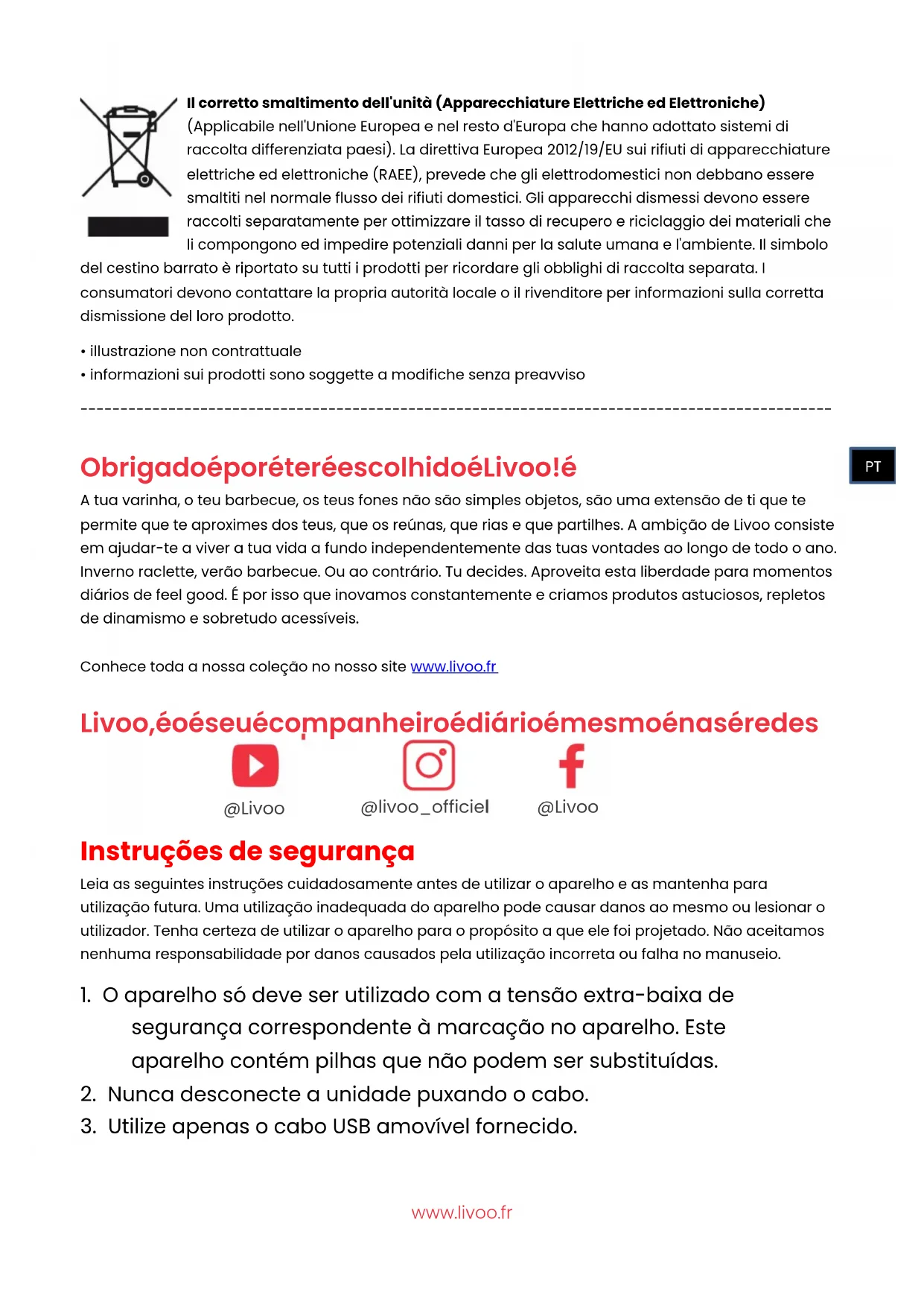 Obrigado por ter escolhido Livoo! A tua varinha, o teu barbecue, os teus fones não são simples objetos, são uma extensão de ti que te permite que te aproximes dos teus, que os reúnas, que rias e que partilhes. A ambição de Livoo consiste em ajudar-te a viver a tua vida a fundo independentemente das tuas vontades ao longo de todo o ano. Inverno raclette, verão barbecue. Ou ao contrário. Tu decides. Aproveita esta liberdade para momentos diários de feel good. É por isso que inovamos constantemente e criamos produtos astuciosos, repletos de dinamismo e sobretudo acessíveis. Conhece toda a nossa coleção no nosso site www.livoo.fr Livoo, o seu companheiro diário mesmo nas redes