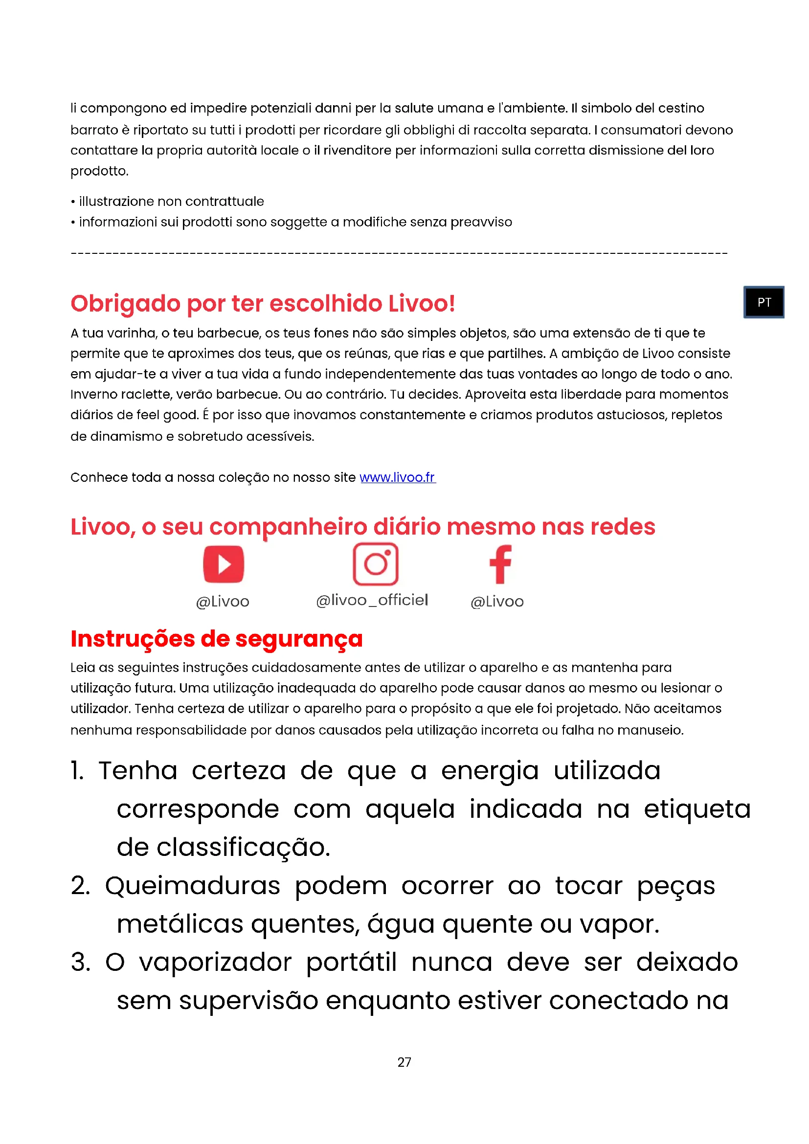 Obrigado por ter escolhido Livoo! A tua varinha, o teu barbecue, os teus fones não são simples objetos, são uma extensão de ti que te permite que te aproximes dos teus, que os reúnas, que rias e que partilhes. A ambição de Livoo consiste em ajudar-te a viver a tua vida a fundo independentemente das tuas vontades ao longo de todo o ano. Inverno raclette, verão barbecue. Ou ao contrário. Tu decides. Aproveita esta liberdade para momentos diários de feel good. É por isso que inovamos constantemente e criamos produtos astuciosos, repletos de dinamismo e sobretudo acessíveis. Conhece toda a nossa coleção no nosso site www.livoo.fr Livoo, o seu companheiro diário mesmo nas redes