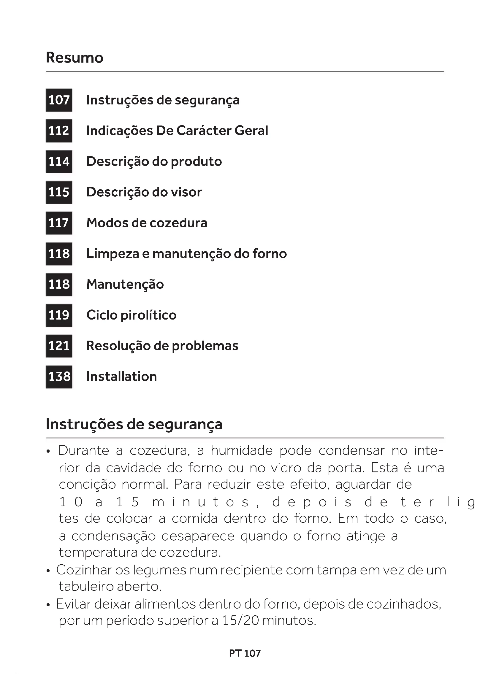 - Evitar deixar alimentos dentro do forno, depois de cozinhados, por um período superior a 15/20 minutos. Instruções de segurançaPT 108
