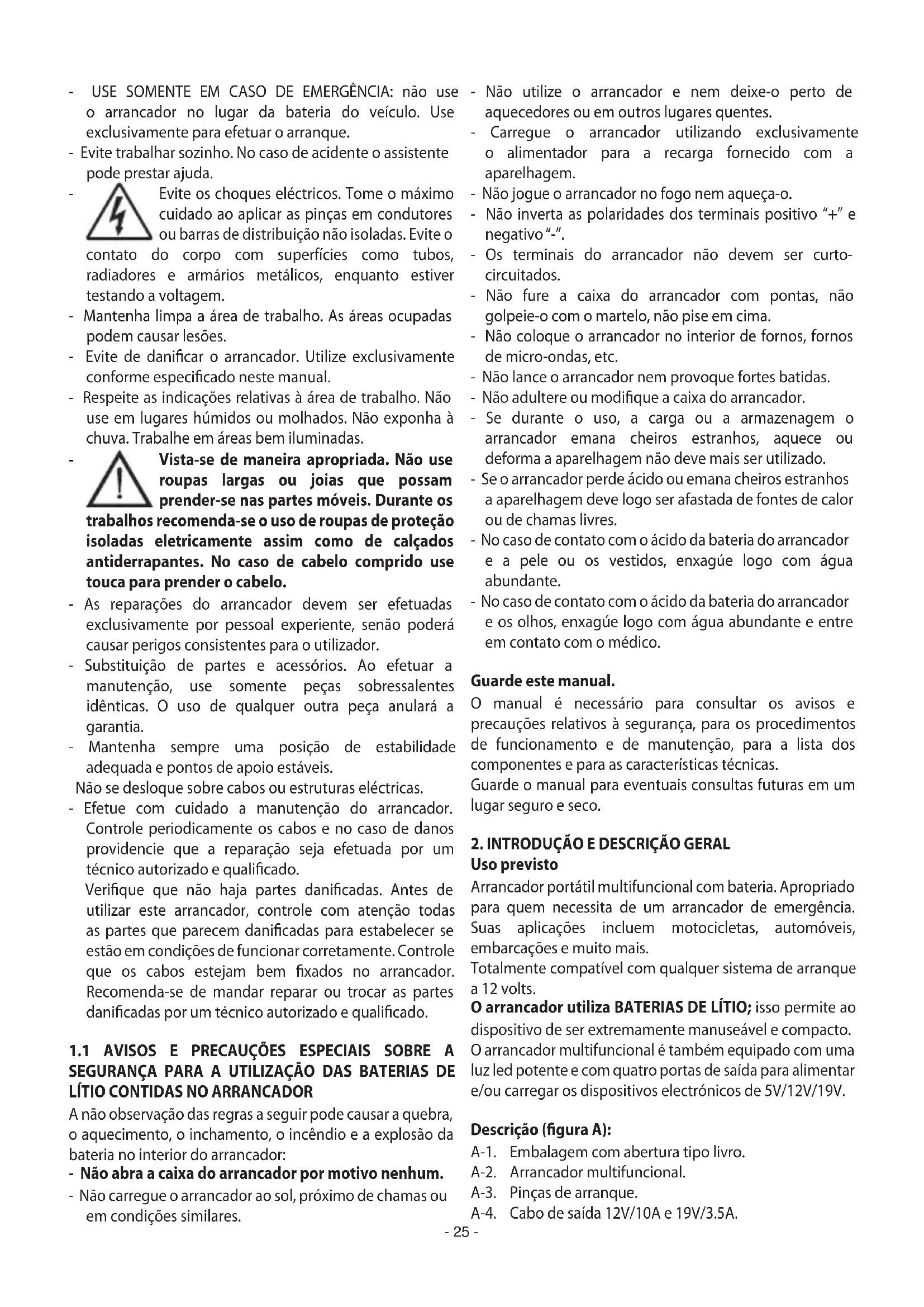 A não observação das regras a seguir pode causar a quebra, o aquecimento, o inchamento, o incêndio e a explosão da bateria no interior do arrancador: - Não abra a caixa do arrancador por motivo nenhum. - Não carregue o arrancador ao sol, próximo de chamas ou em condições similares. - Não utilize o arrancador e nem deixe-o perto de aquecedores ou em outros lugares quentes. - Carregue o arrancador utilizando exclusivamente o alimentador para a recarga fornecido com a aparelhagem. - Não jogue o arrancador no fogo nem aqueça-o. - Não inverta as polaridades dos terminais positivo “+” e negativo “-”. - Os terminais do arrancador não devem ser curto- circuitados. - Não fure a caixa do arrancador com pontas, não golpeie-o com o martelo, não pise em cima. - Não coloque o arrancador no interior de fornos, fornos de micro-ondas, etc. - Não lance o arrancador nem provoque fortes batidas. - Não adultere ou modique a caixa do arrancador. - Se durante o uso, a carga ou a armazenagem o arrancador emana cheiros estranhos, aquece ou deforma a aparelhagem não deve mais ser utilizado. - Se o arrancador perde ácido ou emana cheiros estranhos a aparelhagem deve logo ser afastada de fontes de calor ou de chamas livres. - No caso de contato com o ácido da bateria do arrancador e a pele ou os vestidos, enxagúe logo com água abundante. - No caso de contato com o ácido da bateria do arrancador e os olhos, enxagúe logo com água abundante e entre em contato com o médico. Guarde este manual. O manual é necessário para consultar os avisos e precauções relativos à segurança, para os procedimentos de funcionamento e de manutenção, para a lista dos componentes e para as características técnicas. Guarde o manual para eventuais consultas futuras em um lugar seguro e seco.