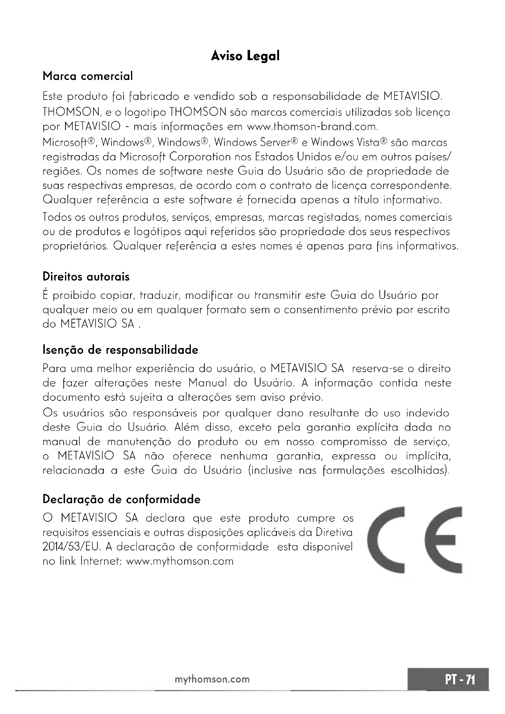 mythomson.com Aviso Legal Marca comercial Este produto foi fabricado e vendido sob a responsabilidade de METAVISIO. THOMSON, e o logotipo THOMSON são marcas comerciais utilizadas sob licença por METAVISIO - mais informações em www.thomson-brand.com. Microsoft®, Windows®, Windows®, Windows Server® e Windows Vista® são marcas registradas da Microsoft Corporation nos Estados Unidos e/ou em outros países/ regiões. Os nomes de software neste Guia do Usuário são de propriedade de suas respectivas empresas, de acordo com o contrato de licença correspondente. Qualquer referência a este software é fornecida apenas a título informativo. Todos os outros produtos, serviços, empresas, marcas registadas, nomes comerciais ou de produtos e logótipos aqui referidos são propriedade dos seus respectivos proprietários. Qualquer referência a estes nomes é apenas para ns informativos. Direitos autorais É proibido copiar, traduzir, modicar ou transmitir este Guia do Usuário por qualquer meio ou em qualquer formato sem o consentimento prévio por escrito do METAVISIO SA . Isenção de responsabilidade Para uma melhor experiência do usuário, o METAVISIO SA reserva-se o direito de fazer alterações neste Manual do Usuário. A informação contida neste documento está sujeita a alterações sem aviso prévio. Os usuários são responsáveis por qualquer dano resultante do uso indevido deste Guia do Usuário. Além disso, exceto pela garantia explícita dada no manual de manutenção do produto ou em nosso compromisso de serviço, o METAVISIO SA não oferece nenhuma garantia, expressa ou implícita, relacionada a este Guia do Usuário (inclusive nas formulações escolhidas). Declaração de conformidade O METAVISIO SA declara que este produto cumpre os requisitos essenciais e outras disposições aplicáveis da Diretiva 2014/53/EU. A declaração de conformidade esta disponível no link Internet: www.mythomson.com72 - PT Manual do Usuário - NEO - 15.6’’ mythomson.com - Instruções de segurança importantes - Esta unidade deve ser utilizada num ambiente com uma temperatura ambiente entre 5°C (41°F) e 35°C (95°F). Não exponha a unidade à chuva ou humidade e mantenha-a afastada de líquidos. Em caso de salpicos de água ou outro líquido na unidade, desligue-a imediatamente e aguarde até que esteja completamente seca antes de a ligar novamente. Não exponha o aparelho diretamente à radiação solar Não utilize solventes fortes, detergentes líquidos ou outros produtos químicos sobre ou perto da superfície da unidade para evitar a corrosão ou deterioração da superfície da unidade. Não exponha a máquina a ambientes poeirentos. Não utilize a unidade durante uma fuga de gás. Não exponha o dispositivo a campos magnéticos ou elétricos fortes. Você pode operar o dispositivo através de detectores de raios X do aeroporto. No entanto, recomenda-se que não passe o seu dispositivo através dos portais de detecção magnética nem o exponha a detetores portáteis. Não coloque quaisquer objetos sobre o dispositivo. Não coloque a unidade sobre uma superfície irregular ou instável. Certique-se de que protege a unidade de quedas ou qualquer outro impacto que a possa danicar. Não deixe o aparelho sobre ou carregado no seu colo ou em qualquer outra parte do seu corpo para evitar qualquer risco de lesões relacionadas com o calor. Desligue o aparelho antes de o transportar ou de o cobrir com um material que não permita uma circulação de ar óptima. Não utilize cabos de alimentação, acessórios ou outros dispositivos danicados com o seu aparelho. Recomendamos a utilização exclusiva dos acessórios (alimentação eléctrica, cabos, etc.) fornecidos com o aparelho.PT - 73 mythomson.com Utilize apenas baterias originais. A substituição da bateria por uma bateria incorreta pode causar risco de explosão. Não desmonte, modique ou repare a unidade por conta própria, pois isso pode anular a garantia. Por favor, faça cópias de segurança do seu conteúdo importante regularmente para evitar a perda de dados. A nossa empresa não aceita qualquer responsabilidade pela perda ou remoção de itens contidos no dispositivo devido à utilização inadequada do hardware ou software, falta de manutenção ou qualquer outro evento acidental. Este produto foi concebido para permitir a reciclagem adequada de peças e componentes. O símbolo que representa um caixote do lixo com uma cruz indica que o dispositivo não deve ser eliminado juntamente com o lixo municipal. Consulte os regulamentos locais para descarte de dispositivos eletrônicos. O símbolo que representa um caixote do lixo com uma cruz indica que a bateria não deve ser eliminada juntamente com os resíduos municipais. Consulte os regulamentos locais para a eliminação da bateria. Para evitar possíveis danos auditivos, não ouvir níveis de som elevados durante longos períodos de tempo.74 - PT Manual do Usuário - NEO - 15.6’’ mythomson.comPT - 75 mythomson.com76 - PT Manual do Usuário - NEO - 15.6’’ mythomson.com - Ligar - Nota : Carregue o seu dispositivo Thomson antes de o utilizar pela primeira vez. Carregar a bateria no seu aparelho Conecte o adaptador AC a uma tomada elétrica aterrada. AVISO : Leia atentamente as seguintes instruções relativas à bateria do seu dispositivo THOMSON: