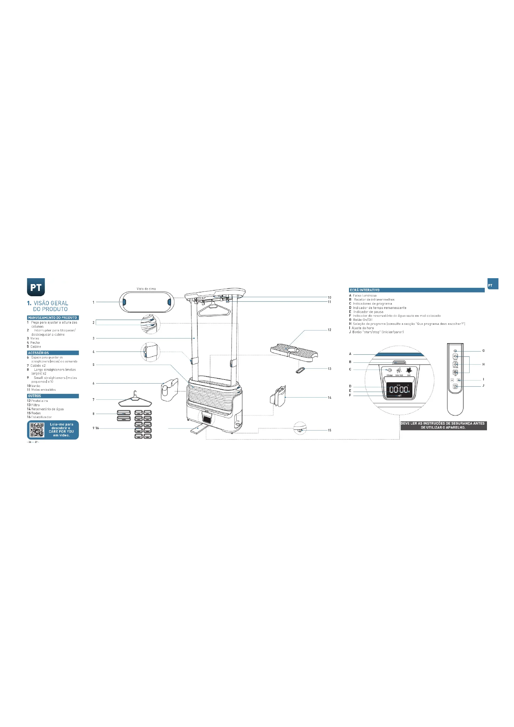 ECRÃ INTERATIVO A Faixa luminosa B Recetor de infravermelhos C Indicadores de programa D Indicador de tempo remanescente E Indicador de pausa F Indicador de reservatório de água vazio ou mal colocado G Botão On/Off H Seleção de programa (consulte a secção "Que programa devo escolher?") I Ajuste da hora J Botão "start/stop" (iniciar/parar) Vista de cima Leia-me para descobrir o