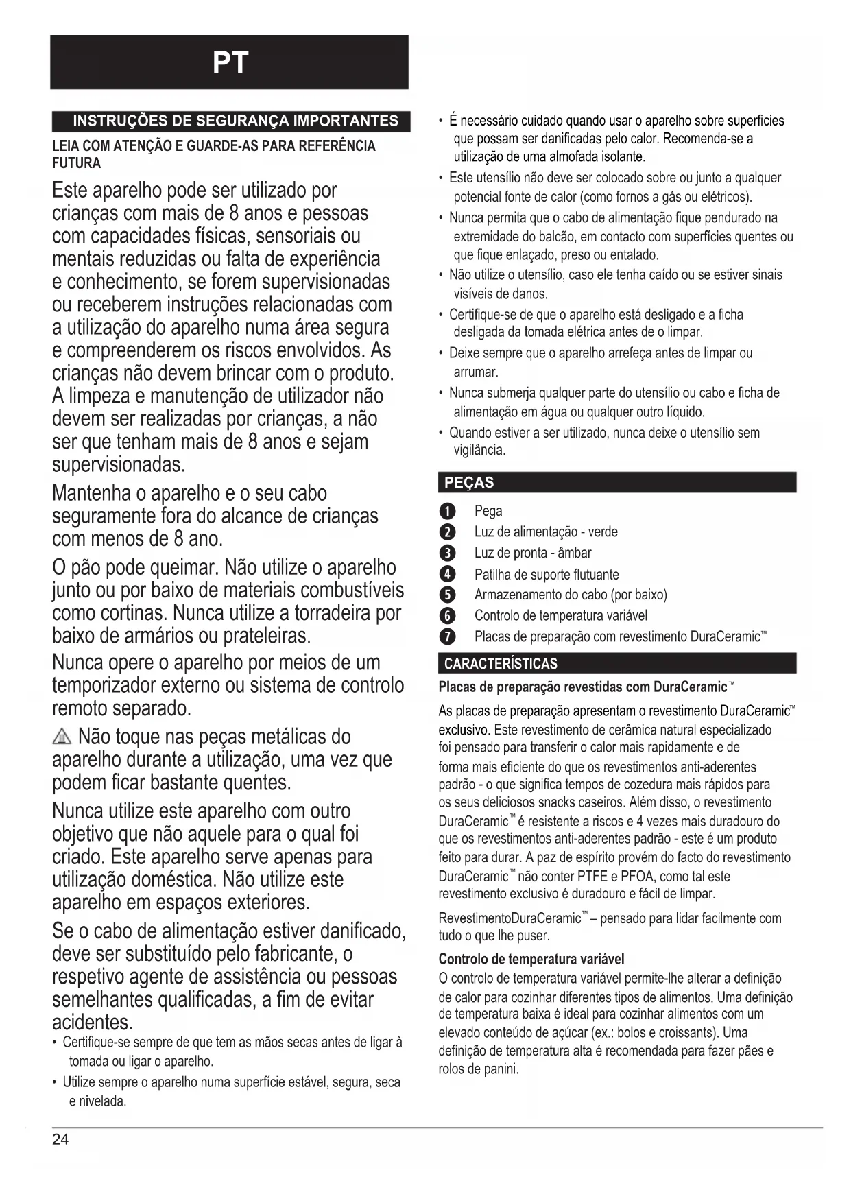 LEIA COM ATENÇÃO E GUARDE-AS PARA REFERÊNCIA FUTURA Este aparelho pode ser utilizado por crianças com mais de 8 anos e pessoas com capacidades físicas, sensoriais ou mentais reduzidas ou falta de experiência e conhecimento, se forem supervisionadas ou receberem instruções relacionadas com a utilização do aparelho numa área segura e compreenderem os riscos envolvidos. As crianças não devem brincar com o produto. A limpeza e manutenção de utilizador não devem ser realizadas por crianças, a não ser que tenham mais de 8 anos e sejam supervisionadas. Mantenha o aparelho e o seu cabo seguramente fora do alcance de crianças com menos de 8 ano. O pão pode queimar. Não utilize o aparelho junto ou por baixo de materiais combustíveis como cortinas. Nunca utilize a torradeira por baixo de armários ou prateleiras. Nunca opere o aparelho por meios de um temporizador externo ou sistema de controlo remoto separado. Não toque nas peças metálicas do aparelho durante a utilização, uma vez que podem car bastante quentes. Nunca utilize este aparelho com outro objetivo que não aquele para o qual foi criado. Este aparelho serve apenas para utilização doméstica. Não utilize este aparelho em espaços exteriores. Se o cabo de alimentação estiver danicado, deve ser substituído pelo fabricante, o respetivo agente de assistência ou pessoas semelhantes qualicadas, a m de evitar acidentes.