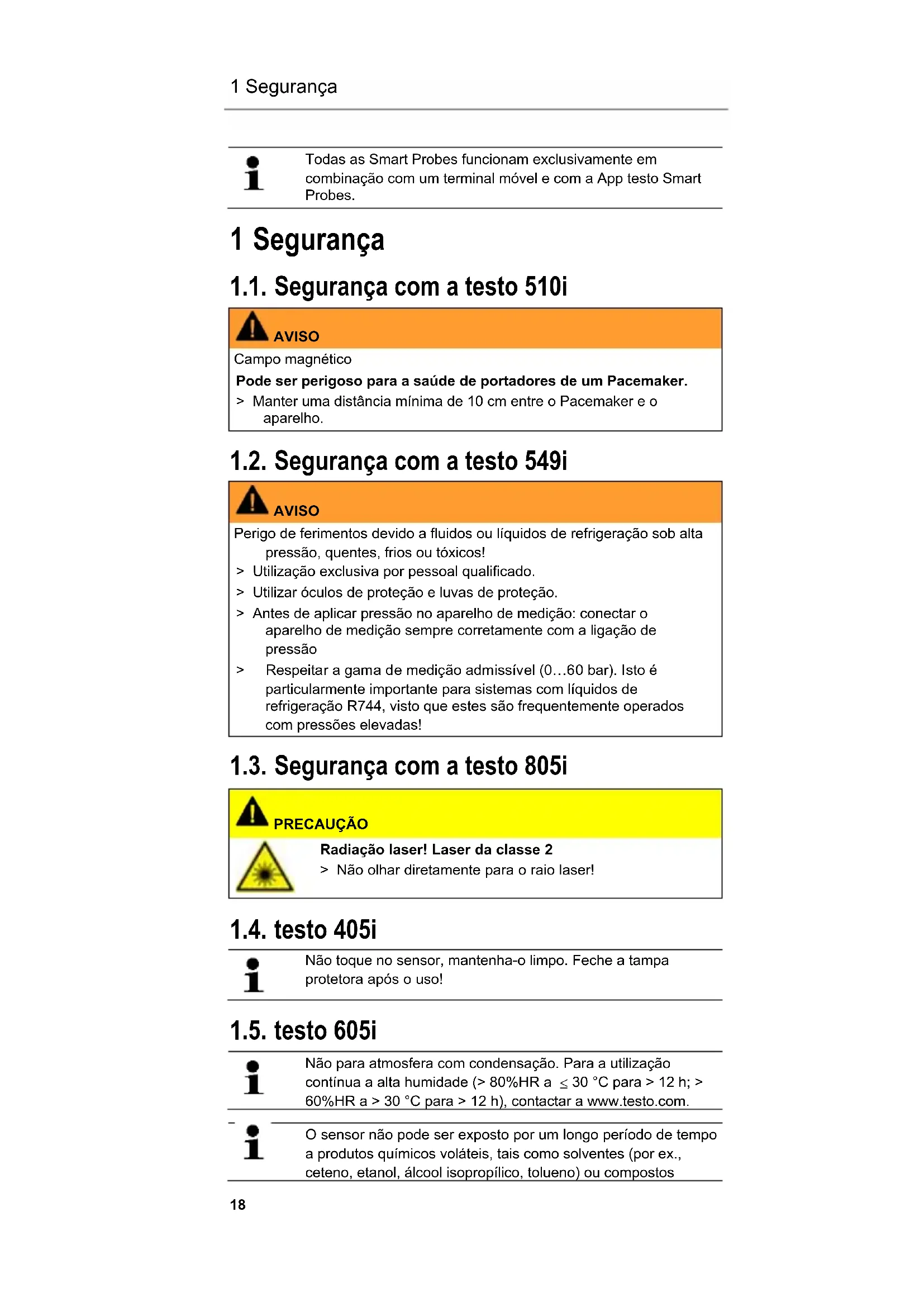 Todas as Smart Probes funcionam exclusivamente em combinação com um terminal móvel e com a App testo Smart Probes. 1 Segurança 1.1. Segurança com a testo 510i AVISO Campo magnético Pode ser perigoso para a saúde de portadores de um Pacemaker. > Manter uma distância mínima de 10 cm entre o Pacemaker e o aparelho. 1.2. Segurança com a testo 549i AVISO Perigo de ferimentos devido a fluidos ou líquidos de refrigeração sob alta pressão, quentes, frios ou tóxicos! > Utilização exclusiva por pessoal qualificado. > Utilizar óculos de proteção e luvas de proteção. > Antes de aplicar pressão no aparelho de medição: conectar o aparelho de medição sempre corretamente com a ligação de pressão > Respeitar a gama de medição admissível (0…60 bar). Isto é particularmente importante para sistemas com líquidos de refrigeração R744, visto que estes são frequentemente operados com pressões elevadas! 1.3. Segurança com a testo 805i PRECAUÇÃO Radiação laser! Laser da classe 2 > Não olhar diretamente para o raio laser! 1.4. testo 405i Não toque no sensor, mantenha-o limpo. Feche a tampa protetora após o uso! 1.5. testo 605i Não para atmosfera com condensação. Para a utilização contínua a alta humidade (> 80%HR a