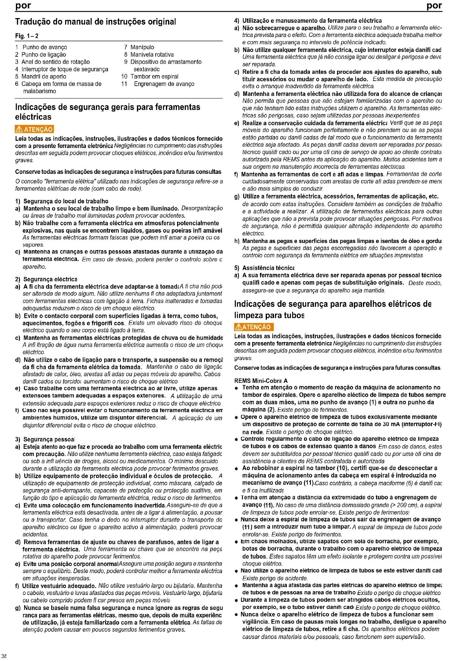 Leia todas as indicações, instruções, ilustrações e dados técnicos fornecidos com a presente ferramenta eletrónica. Negligências no cumprimento das instruções descritas em seguida podem provocar choques elétricos, incêndios e/ou ferimentos graves. Conserve todas as indicações de segurança e instruções para futuras consultas. REMS Mini-Cobra
