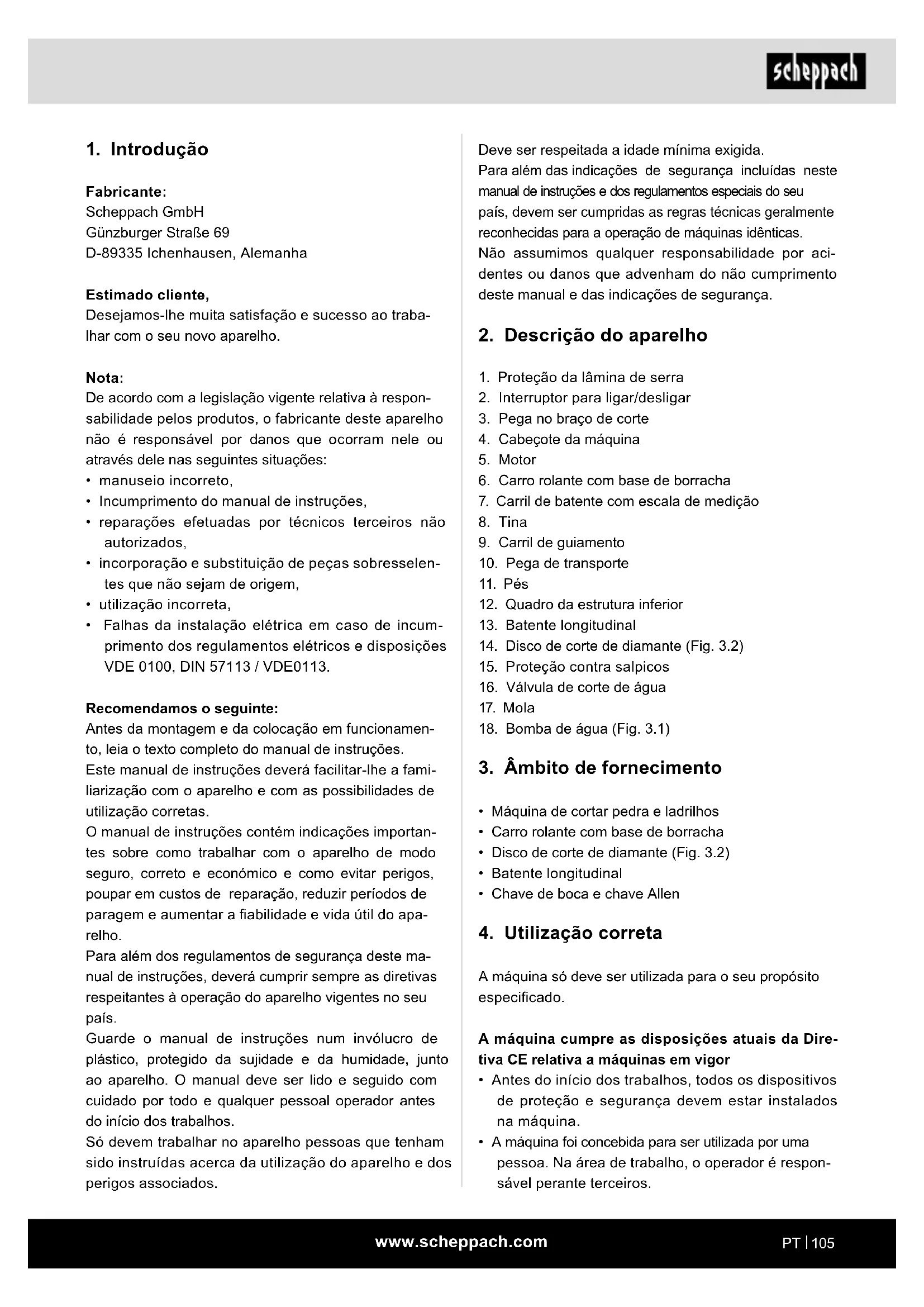 - Falhas da instalação elétrica em caso de incum- primento dos regulamentos elétricos e disposições VDE 0100, DIN 57113 / VDE0113. Recomendamos o seguinte: Antes da montagem e da colocação em funcionamen- to, leia o texto completo do manual de instruções. Este manual de instruções deverá facilitar-lhe a fami- liarização com o aparelho e com as possibilidades de utilização corretas. O manual de instruções contém indicações importan- tes sobre como trabalhar com o aparelho de modo seguro, correto e económico e como evitar perigos, poupar em custos de reparação, reduzir períodos de paragem e aumentar a abilidade e vida útil do apa- relho. Para além dos regulamentos de segurança deste ma- nual de instruções, deverá cumprir sempre as diretivas respeitantes à operação do aparelho vigentes no seu país. Guarde o manual de instruções num invólucro de plástico, protegido da sujidade e da humidade, junto ao aparelho. O manual deve ser lido e seguido com cuidado por todo e qualquer pessoal operador antes do início dos trabalhos. Só devem trabalhar no aparelho pessoas que tenham sido instruídas acerca da utilização do aparelho e dos perigos associados.www.scheppach.com