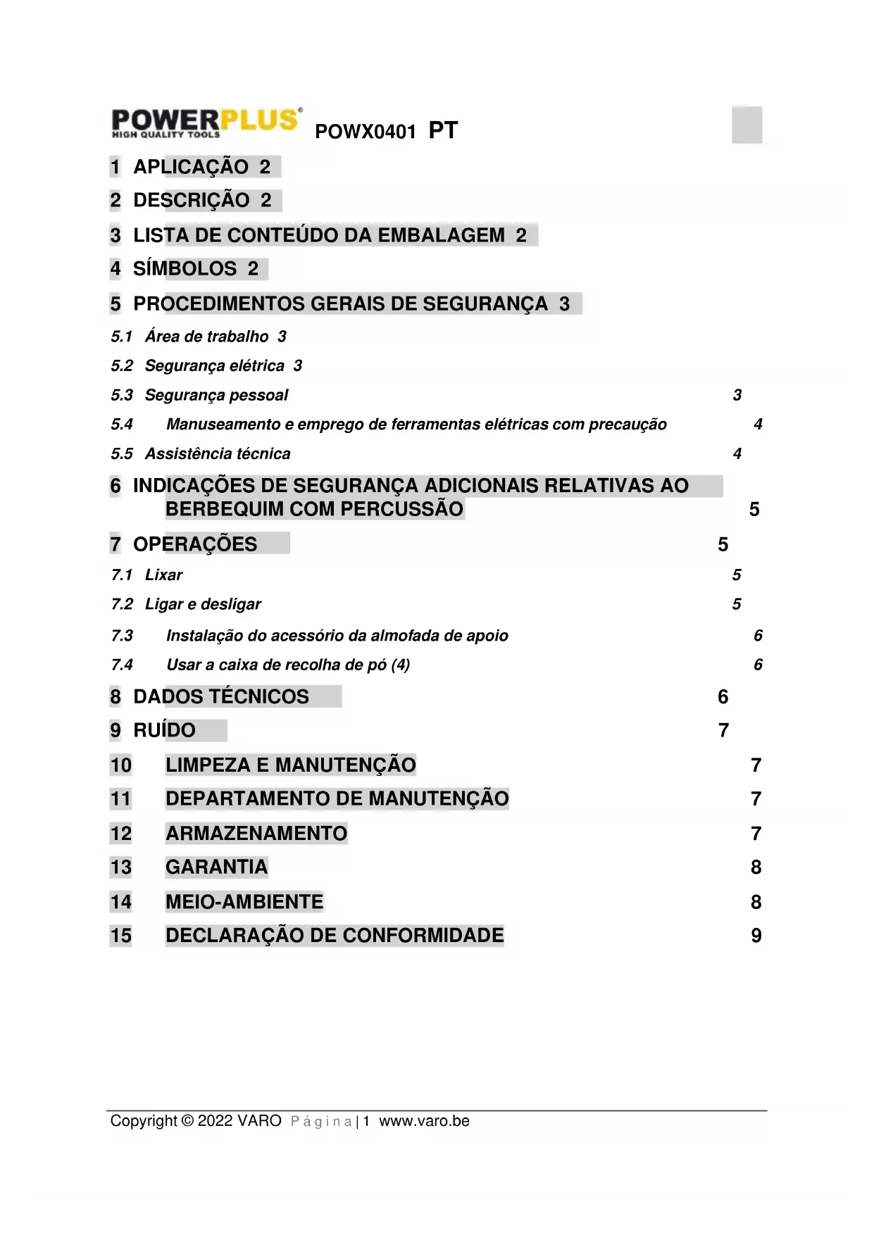 - Esteja atento. Esteja concentrado e seja sensato ao trabalhar com uma ferramenta elétrica. Não utilize o aparelho se estiver cansado ou sob a influência de estupefacientes, álcool ou medicamentos. Um momento de distração durante a utilização do aparelho pode provocar ferimentos graves.POWX0401 PT Copyright © 2022 VARO P á g i n a | 4 www.varo.be