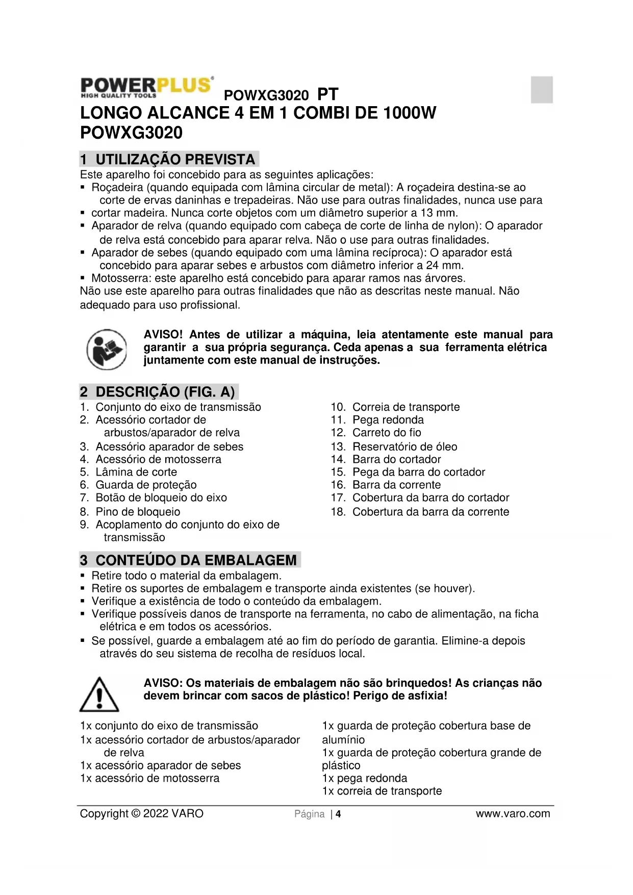 - Se possível, guarde a embalagem até ao fim do período de garantia. Elimine-a depois através do seu sistema de recolha de resíduos local. AVISO: Os materiais de embalagem não são brinquedos! As crianças não devem brincar com sacos de plástico! Perigo de asfixia! 1x conjunto do eixo de transmissão 1x acessório cortador de arbustos/aparador de relva 1x acessório aparador de sebes 1x acessório de motosserra 1x guarda de proteção cobertura base de alumínio 1x guarda de proteção cobertura grande de plástico 1x pega redonda 1x correia de transportePOWXG3020 PT Copyright © 2022 VARO Página | 5 www.varo.com 1x carreto do fio 1x lâmina de corte 1x chave sextavada (na pega redonda) 1x chave múltipla (na manga da barra da corrente) 1x tensionador 14 mm 1x corrente 8” 1x barra da corrente 8” 1x manga da barra da corrente 1x manga da barra da cortador 1x porca 14 mm 1x anilha preta 1x manual Caso haja partes em falta ou danificadas, por favor, contacte o seu comerciante. 4 SÍMBOLOS Neste manual e/ou na máquina são utilizados os seguintes símbolos: