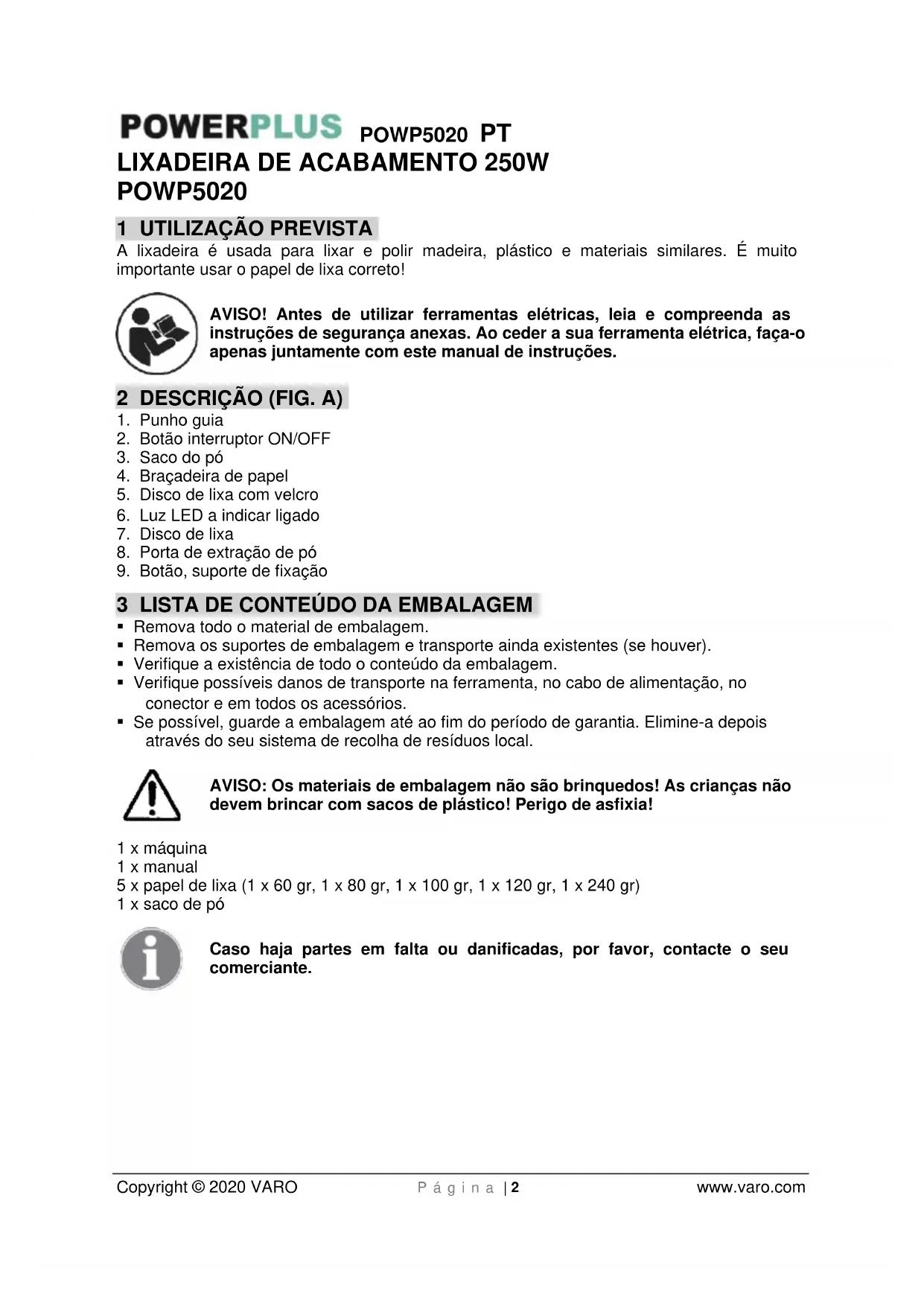 - Se possível, guarde a embalagem até ao fim do período de garantia. Elimine-a depois através do seu sistema de recolha de resíduos local. AVISO: Os materiais de embalagem não são brinquedos! As crianças não devem brincar com sacos de plástico! Perigo de asfixia! 1 x máquina 1 x manual 5 x papel de lixa (1 x 60 gr, 1 x 80 gr, 1 x 100 gr, 1 x 120 gr, 1 x 240 gr) 1 x saco de pó Caso haja partes em falta ou danificadas, por favor, contacte o seu comerciante.POWP5020 PT Copyright © 2020 VARO P á g i n a | 3 www.varo.com 4 SÍMBOLOS Neste manual e/ou na máquina são utilizados os seguintes símbolos: