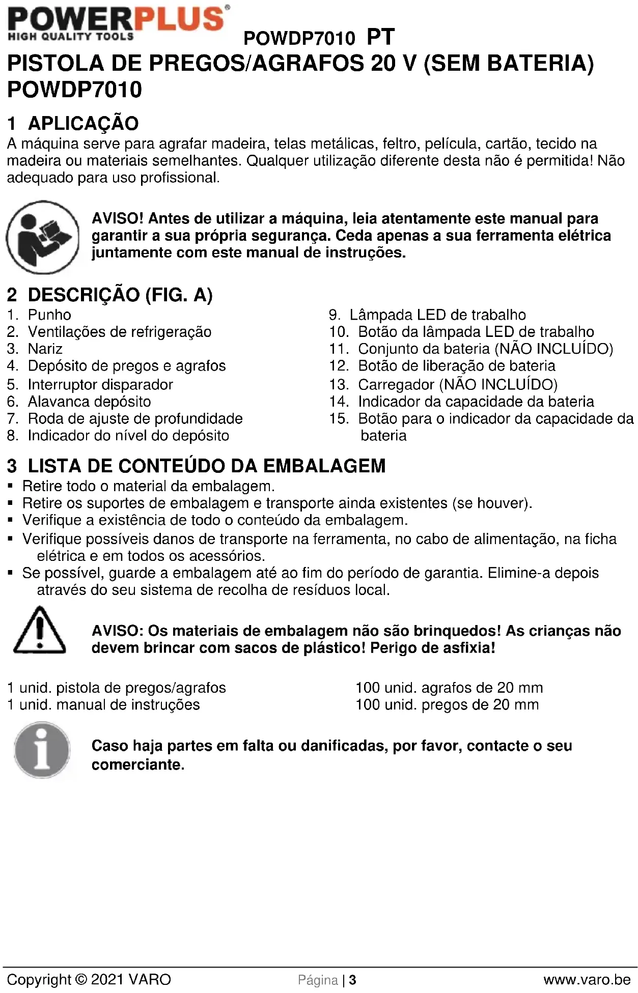 VARO – Vic. Van Rompuy N.V. – Joseph Van Instraat 9 – BE2500 Lier – Bélgica, declara que, Designação do aparelho: Pistola de Pregos/Agrafos 20 V - operado a bateria Marca: PowerPlus Modelo nº.: POWDP7010 se encontra em conformidade com os requisitos essenciais e outras provisões relevantes das Diretivas Comunitárias aplicáveis, com base na aplicação das normas Europeias harmonizadas. Qualquer alteração não autorizada do equipamento anula esta declaração. Diretivas Europeias (incluindo, se aplicável, as respetivas emendas até à data de assinatura): 2011/65/EU 2006/42/EC 2014/30/EU Normas Europeias harmonizadas (incluindo, se aplicável, as respetivas emendas até à data de assinatura): EN60745-1 : 2009 EN60745-2-16 : 2010 EN55014-1 : 2017 EN55014-2 : 2015 Detentor da Documentação Técnica: Philippe Vankerkhove, VARO – Vic. Van Rompuy N.V. O signatário atua em nome da administração da empresa, Ludo Mertens Certification Manager 17/09/2020, Lier - BelgiumPOWDP7010 NO Copyright © 2021 VARO Side | 1 www.varo.be 1 BRUKSOMRÅDE ............................................................................. 3
