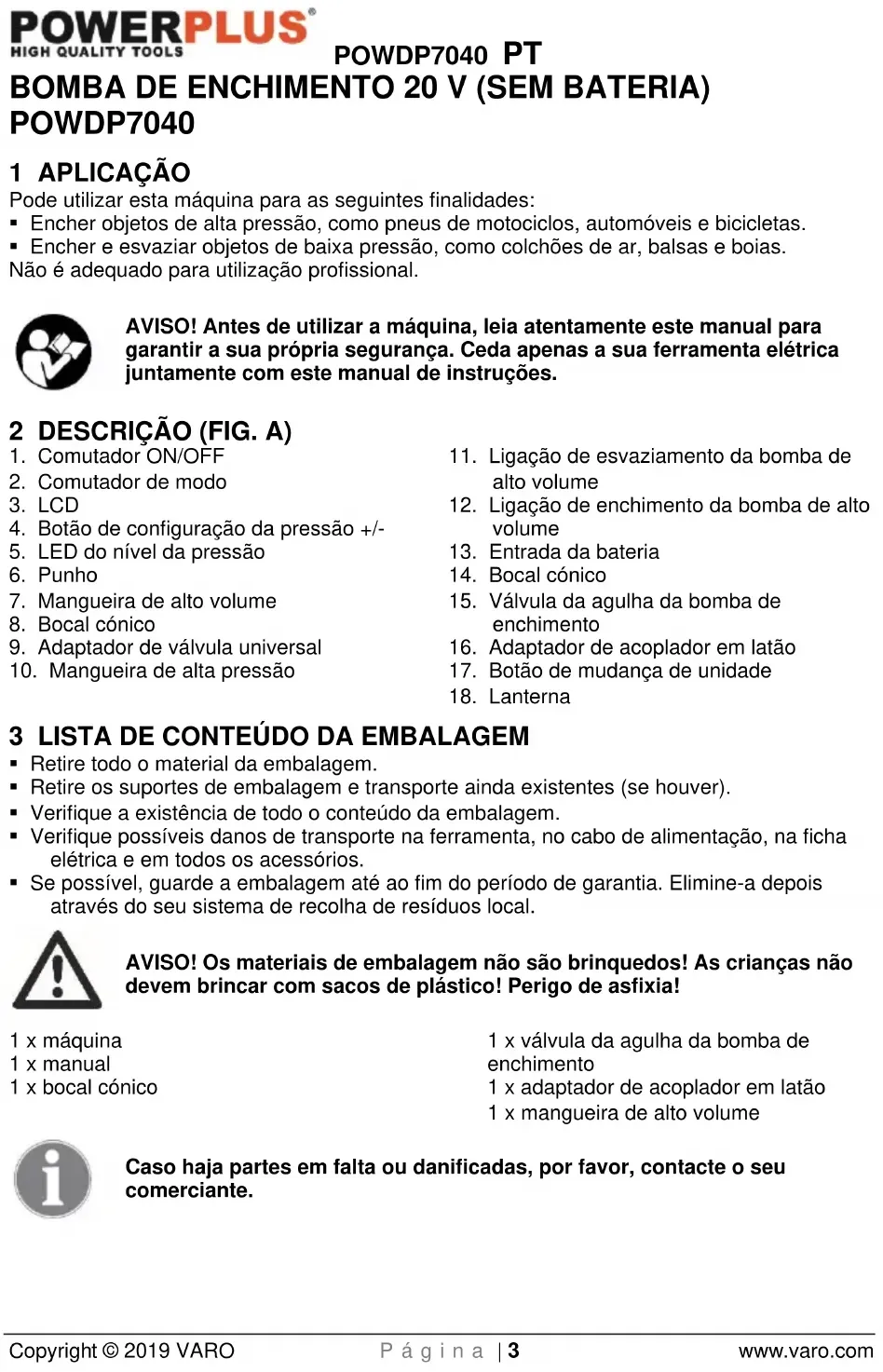 - Se possível, guarde a embalagem até ao fim do período de garantia. Elimine-a depois através do seu sistema de recolha de resíduos local. AVISO! Os materiais de embalagem não são brinquedos! As crianças não devem brincar com sacos de plástico! Perigo de asfixia! 1 x máquina 1 x manual 1 x bocal cónico 1 x válvula da agulha da bomba de enchimento 1 x adaptador de acoplador em latão 1 x mangueira de alto volume Caso haja partes em falta ou danificadas, por favor, contacte o seu comerciante.POWDP7040 PT Copyright © 2019 VARO P á g i n a | 4 www.varo.com 4 SÍMBOLOS Neste manual e/ou na máquina são utilizados os seguintes símbolos: