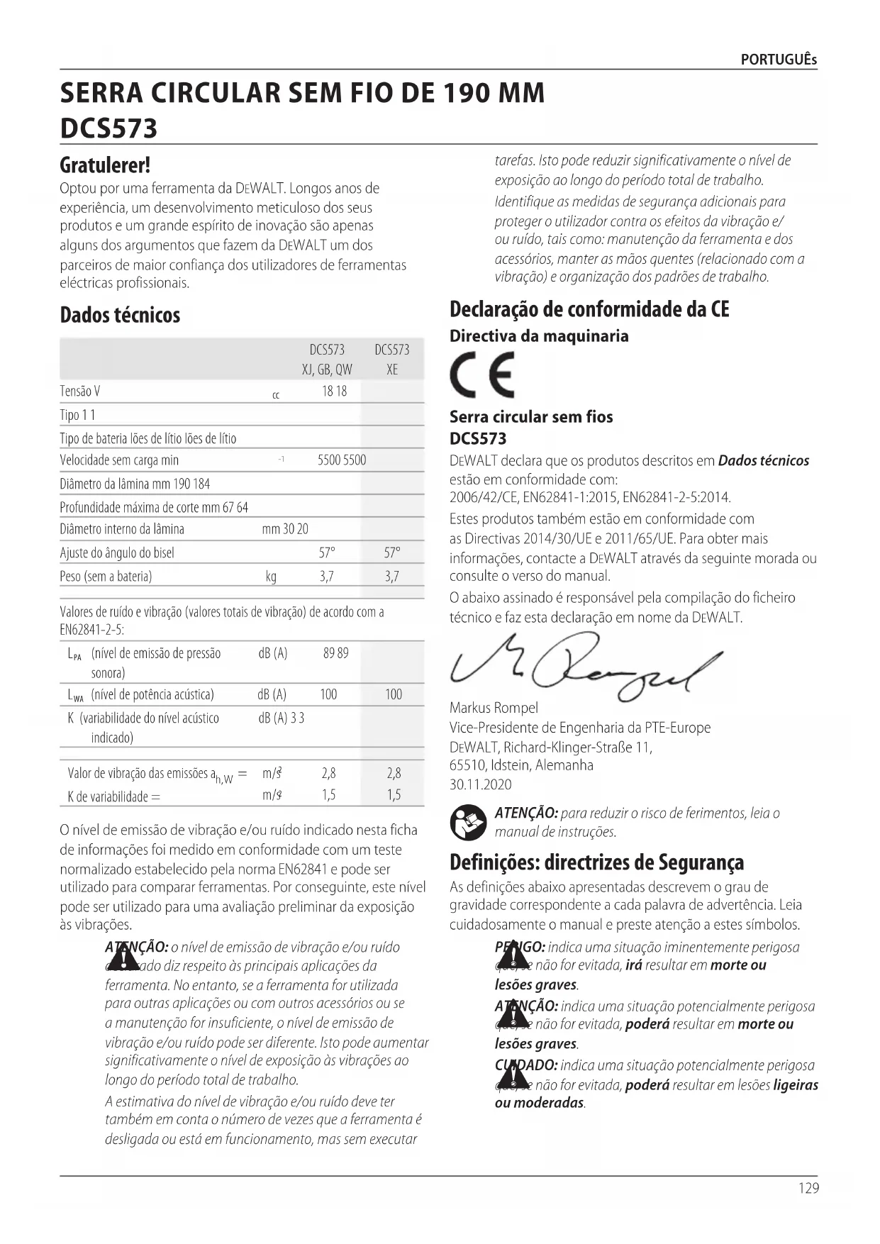 merinformasjon. IKKE BRUK TILBEHØR FOR VANNTILFØRSEL MED DENNESAGEN. HARDMETALLBLAD SKAL INSPISERES VISUELT FØR BRUK.SKIFT UT DERSOMSKADET. Ta kontakt med din forhandler for ytterligere informasjon om egnetekstrautstyr.129 PORTUGUês ATENÇÃO: para reduzir o risco de ferimentos, leia o manual deinstruções. Definições: directrizes de Segurança As definições abaixo apresentadas descrevem o grau de gravidade correspondente a cada palavra de advertência. Leia cuidadosamente o manual e preste atenção a estessímbolos. PERIGO: indica uma situação iminentemente perigosa que, se não for evitada, irá resultar em morte ou lesõesgraves. ATENÇÃO: indica uma situação potencialmente perigosa que, se não for evitada, poderá resultar em morte ou lesõesgraves. CUIDADO: indica uma situação potencialmente perigosa que, se não for evitada, poderá resultar em lesões ligeiras oumoderadas. Declaração de conformidade da CE Directiva da maquinaria Serra circular sem fios DCS573 DeWALT declara que os produtos descritos em Dados técnicos estão em conformidade com: 2006/42/CE, EN62841‑1:2015, EN62841‑2‑5:2014.Estes produtos também estão em conformidade com as Directivas 2014/30/UE e 2011/65/UE. Para obter mais informações, contacte a DeWALT através da seguinte morada ou consulte o verso domanual.O abaixo assinado é responsável pela compilação do ficheiro técnico e faz esta declaração em nome daDeWALT.Markus Rompel Vice‑Presidente de Engenharia da PTE‑Europe DeWALT, Richard‑Klinger‑Straße 11, 65510, Idstein, Alemanha 30.11.2020tarefas. Isto pode reduzir significativamente o nível de exposição ao longo do período total detrabalho.Identifique as medidas de segurança adicionais para proteger o utilizador contra os efeitos da vibração e/ou ruído, tais como: manutenção da ferramenta e dos acessórios, manter as mãos quentes (relacionado com a vibração) e organização dos padrões detrabalho.O nível de emissão de vibração e/ou ruído indicado nesta ficha de informações foi medido em conformidade com um teste normalizado estabelecido pela norma EN62841e pode ser utilizado para comparar ferramentas. Por conseguinte, este nível pode ser utilizado para uma avaliação preliminar da exposição àsvibrações. ATENÇÃO: o nível de emissão de vibração e/ou ruído declarado diz respeito às principais aplicações da ferramenta. No entanto, se a ferramenta for utilizada para outras aplicações ou com outros acessórios ou se a manutenção for insuficiente, o nível de emissão de vibração e/ou ruído pode ser diferente. Isto pode aumentar significativamente o nível de exposição às vibrações ao longo do período total detrabalho.A estimativa do nível de vibração e/ou ruído deve ter também em conta o número de vezes que a ferramenta é desligada ou está em funcionamento, mas sem executar DCS573 XJ, GB, QWDCS573 Tensão V 18 18Tipo 1 1Tipo de bateria Iões de lítio Iões de lítioVelocidade sem carga min 5500 5500Diâmetro da lâmina mm 190 184Profundidade máxima de corte mm 67 64Diâmetro interno da lâmina mm 30 20Ajuste do ângulo do bisel 57° 57° Peso (sem a bateria) kg 3,7 3,7 Valores de ruído e vibração (valores totais de vibração) de acordo com a EN62841‑2‑5: