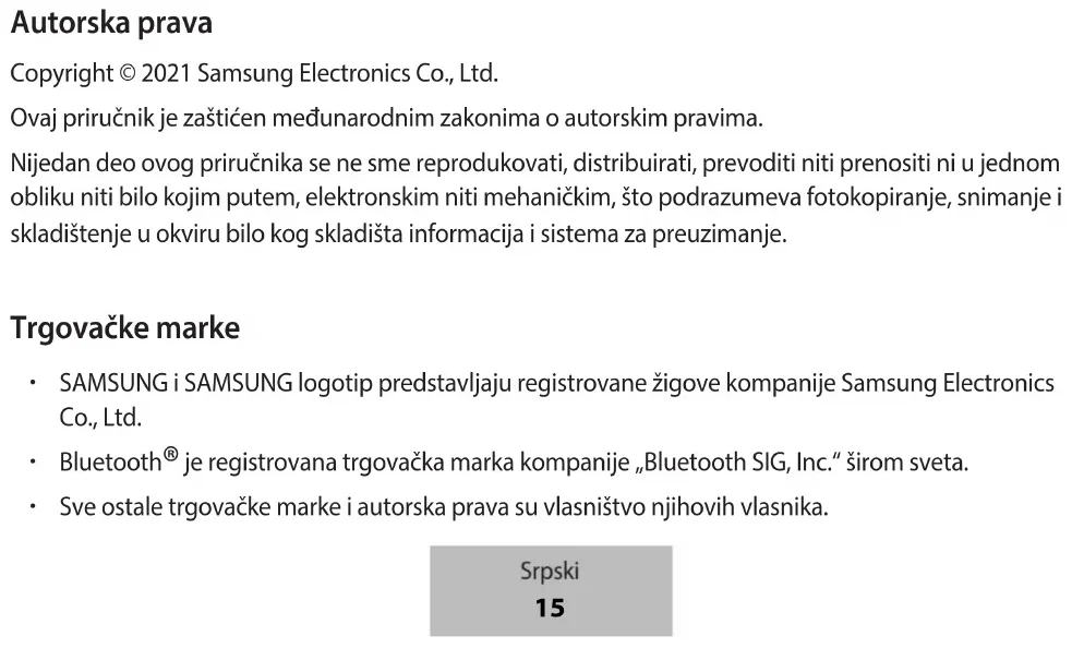 A Samsung não se responsabiliza por quaisquer danos ou perdas (seja por contrato ou dano, incluindo negligência) que podem surgir pelo facto de não seguir à risca estes avisos e instruções, além de morte ou ferimentos pessoais causados por negligência da Samsung. Português 14Copyright Copyright © 2021 Samsung Electronics Co., Ltd. Este manual está protegido pelas leis internacionais de copyright. Nenhuma parte deste manual pode ser reproduzida, traduzida ou transmitida de maneira alguma, nem por nenhum meio, eletrónico ou mecânico, incluindo fotocópia, gravação ou armazenada em armazenamento de informação ou sistema de obtenção. Marcas Registadas