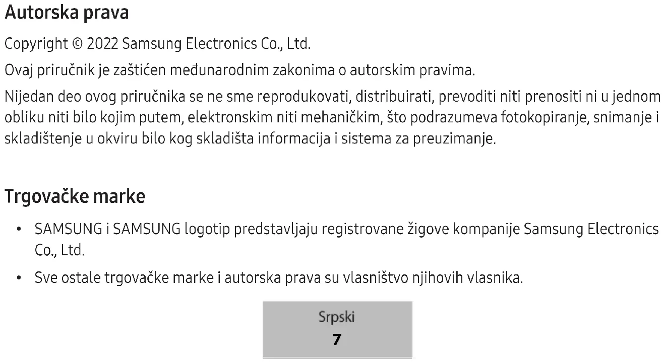 A disponibilidade de todos os acessórios está sujeita a alteração dependendo integralmente das empresas fabricantes. Para mais informações sobre os acessórios disponíveis, consulte o site da Samsung. Português (Brasil) 6Direitos autorais Direitos autorais © 2022 Samsung Electronics Co., Ltd. Esse manual está protegido pelas leis internacionais dos direitos autorais. Nenhuma parte deste manual pode ser reproduzida, distribuída, traduzida ou transmitida por qualquer forma ou por qualquer meio, eletrônico ou impresso, incluindo fotocópia, gravação ou armazenamento em qualquer sistema de armazenagem e recuperação. Marcas registradas