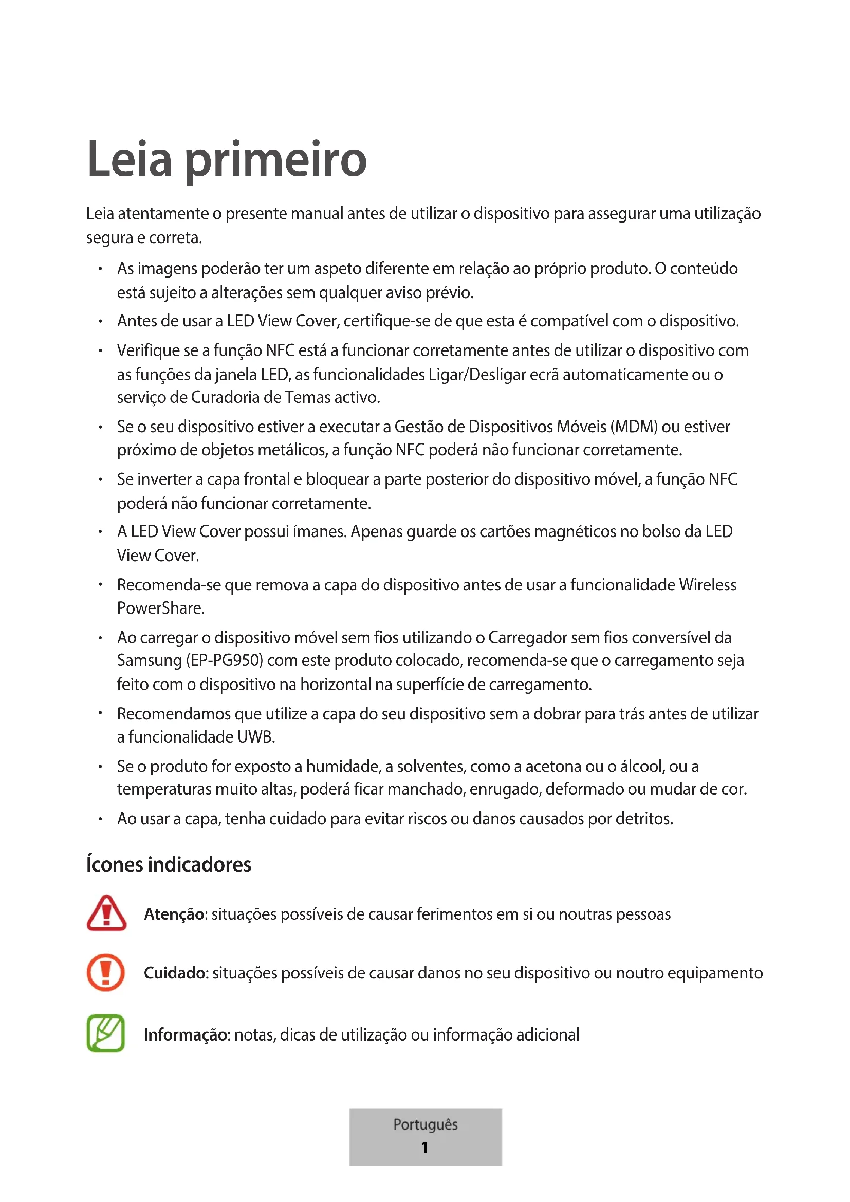 Ao usar a capa, tenha cuidado para evitar riscos ou danos causados por detritos. Ícones indicadores Atenção: situações possíveis de causar ferimentos em si ou noutras pessoas Cuidado: situações possíveis de causar danos no seu dispositivo ou noutro equipamento Informação: notas, dicas de utilização ou informação adicional Português