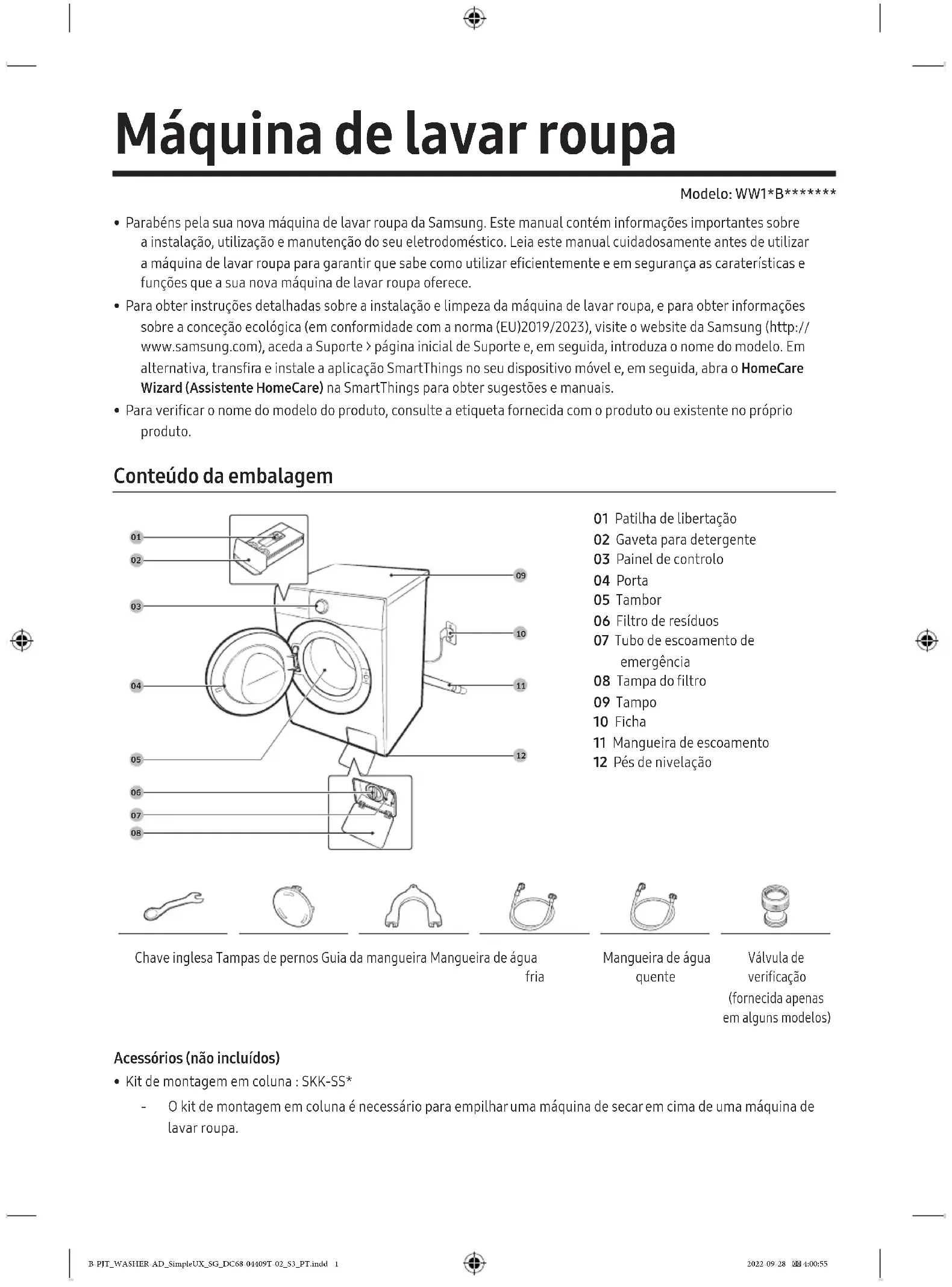 - Kit de montagem em coluna : SKK-SS* ‐ O kit de montagem em coluna é necessário para empilhar uma máquina de secar em cima de uma máquina de lavar roupa. B-PJT_WASHER-AD_SimpleUX_SG_DC68-04409T-02_S3_PT.indd 1 2022-09-28 4:00:55Português2 Informações de segurança NOTA