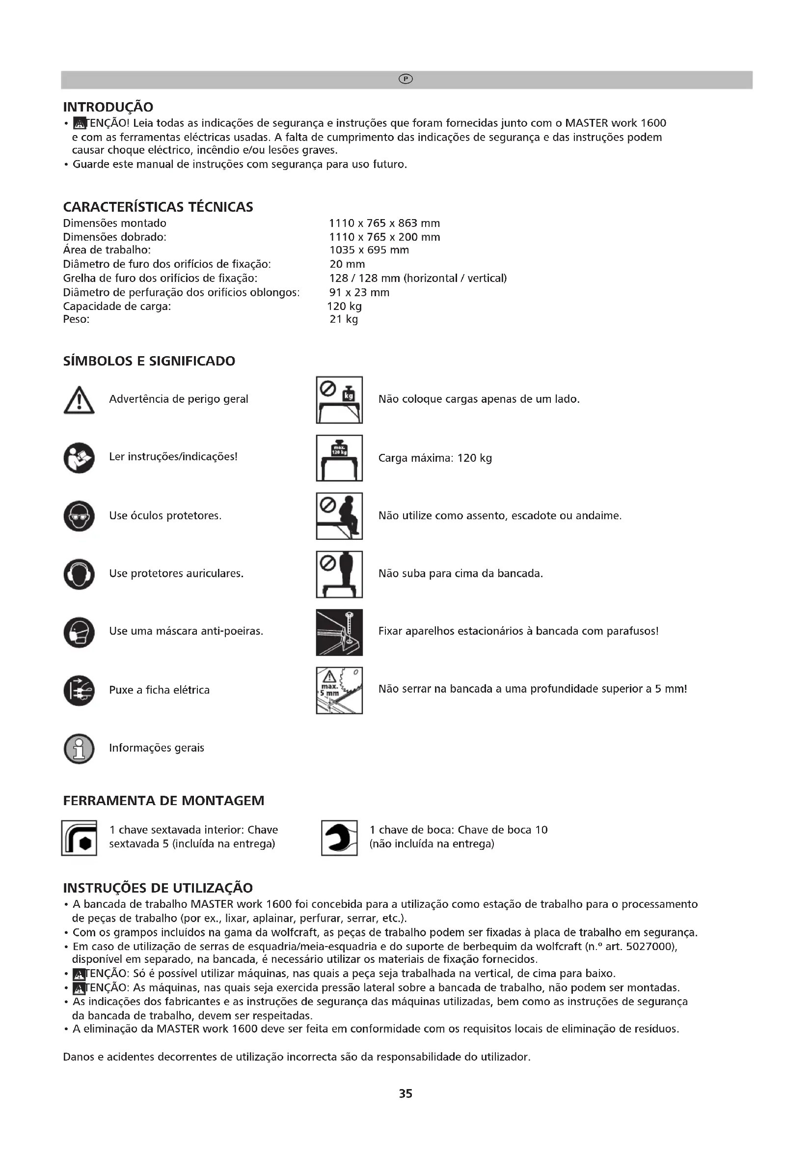 Não coloque cargas apenas de um lado. Carga máxima: 120 kg Não utilize como assento, escadote ou andaime. Não suba para cima da bancada. Fixar aparelhos estacionários à bancada com parafusos! Não serrar na bancada a uma profundidade superior a 5 mm! Advertência de perigo geral Ler instruções/indicações! Use óculos protetores. Use protetores auriculares. Puxe a ficha elétrica Informações gerais Use uma máscara anti-poeiras.