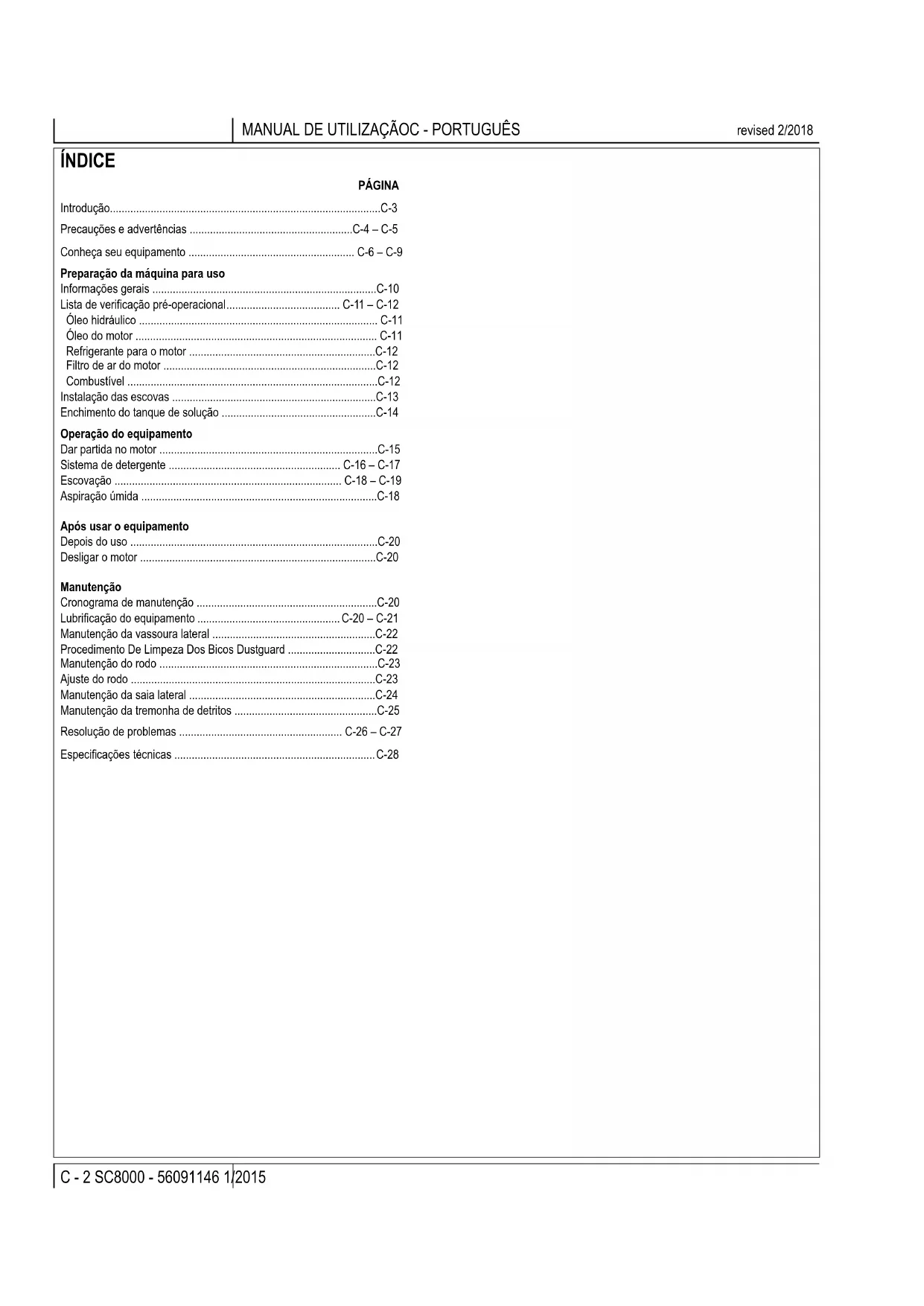 Capacidad de ascenso Transporte 16% (9°) 16% (9°) 16% (9°) Limpieza 10,5% (6°) 10,5% (6°) 10,5% (6°) revised 5/2015C - 2 SC8000 - 56091146 1/2015 MANUAL DE UTILIZAÇÃOC - PORTUGUÊS ÍNDICE PÁGINA Introdução .............................................................................................C-3 Precauções e advertências ........................................................C-4 – C-5 Conheça seu equipamento ......................................................... C-6 – C-9 Preparação da máquina para uso Informações gerais .............................................................................C-10 Lista de verifi cação pré-operacional ....................................... C-11 – C-12 Óleo hidráulico .................................................................................. C-11 Óleo do motor ................................................................................... C-11 Refrigerante para o motor ................................................................C-12 Filtro de ar do motor .........................................................................C-12 Combustível ......................................................................................C-12 Instalação das escovas ......................................................................C-13 Enchimento do tanque de solução .....................................................C-14 Operação do equipamento Dar partida no motor ...........................................................................C-15 Sistema de detergente ........................................................... C-16 – C-17 Escovação .............................................................................. C-18 – C-19 Aspiração úmida .................................................................................C-18 Após usar o equipamento Depois do uso .....................................................................................C-20 Desligar o motor .................................................................................C-20 Manutenção Cronograma de manutenção ..............................................................C-20 Lubrifi cação do equipamento .................................................C-20 – C-21 Manutenção da vassoura lateral ........................................................C-22 Procedimento De Limpeza Dos Bicos Dustguard ..............................C-22 Manutenção do rodo ...........................................................................C-23 Ajuste do rodo ....................................................................................C-23 Manutenção da saia lateral ................................................................C-24 Manutenção da tremonha de detritos .................................................C-25 Resolução de problemas ........................................................ C-26 – C-27 Especifi cações técnicas .....................................................................C-28 revised 2/20181/2015 C - 3 56091146 - SC8000 PORTUGUÊS - CMANUAL DE UTILIZAÇÃO INTRODUÇÃO Este manual o ajudará a obter o máximo da sua Nilfi sk Rider Scrubber. Leia cuidadosamente antes de operar o equipamento. Nota: Os números em negrito entre parênteses indicam um item ilustrado nas páginas 6 – 9.