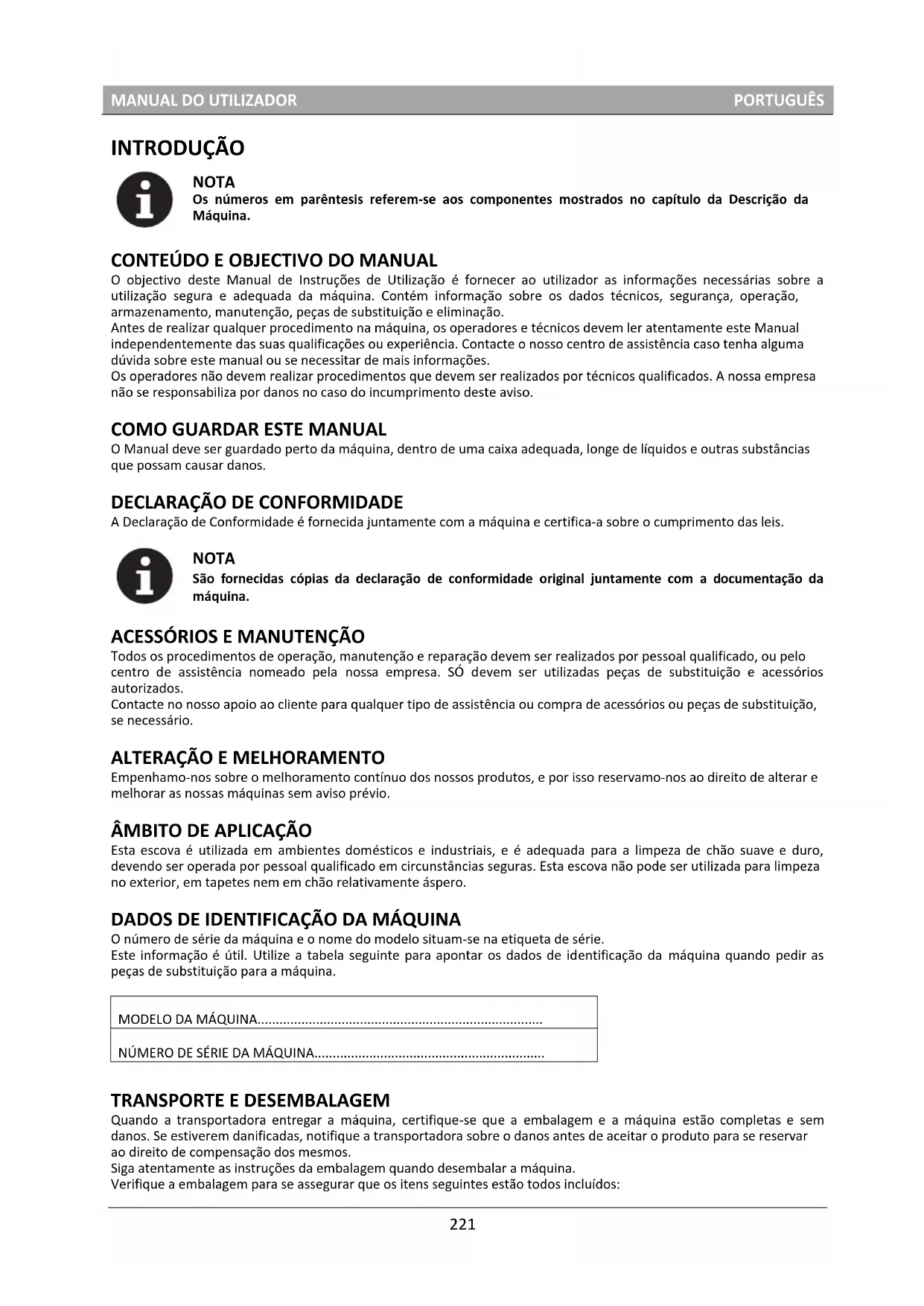O objectivo deste Manual de Instruções de Utilização é fornecer ao utilizador as informações necessárias sobre a utilização segura e adequada da máquina. Contém informação sobre os dados técnicos, segurança, operação, armazenamento, manutenção, peças de substituição e eliminação. Antes de realizar qualquer procedimento na máquina, os operadores e técnicos devem ler atentamente este Manual independentemente das suas qualificações ou experiência. Contacte o nosso centro de assistência caso tenha alguma dúvida sobre este manual ou se necessitar de mais informações. Os operadores não devem realizar procedimentos que devem ser realizados por técnicos qualificados. A nossa empresa não se responsabiliza por danos no caso do incumprimento deste aviso.