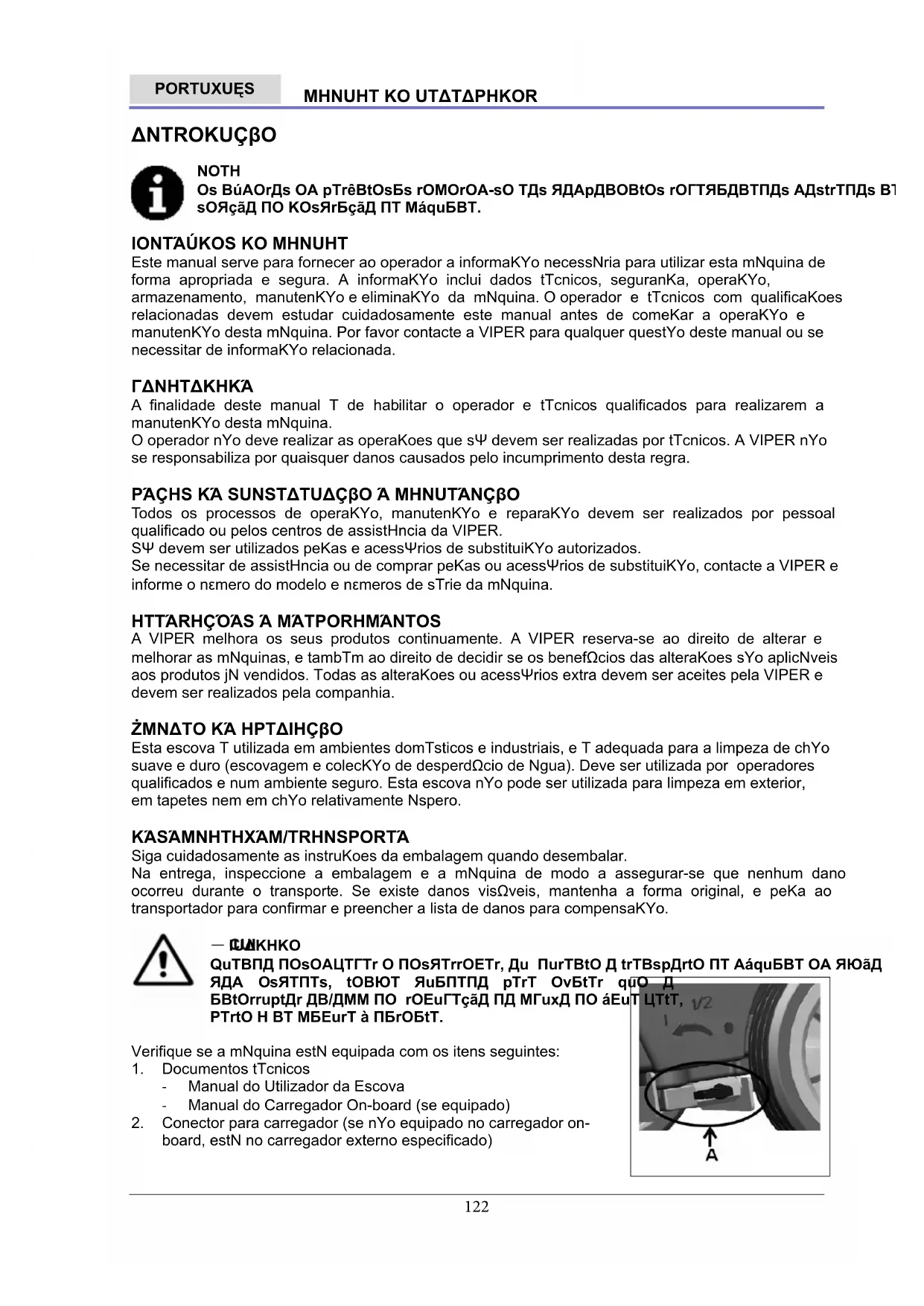 NOTA Se a máquina estiver instalada com o carregador on-board opcional, e quando o mesmo estiver com defeito, a máquina não pode ser operada. Se o carregador on-board estiver com defeito, contacte o centro de manutenção autorizado. Para mais informação, refira ao manual de manutenção (disponível em qualquer centro de manutenção da VIPER)