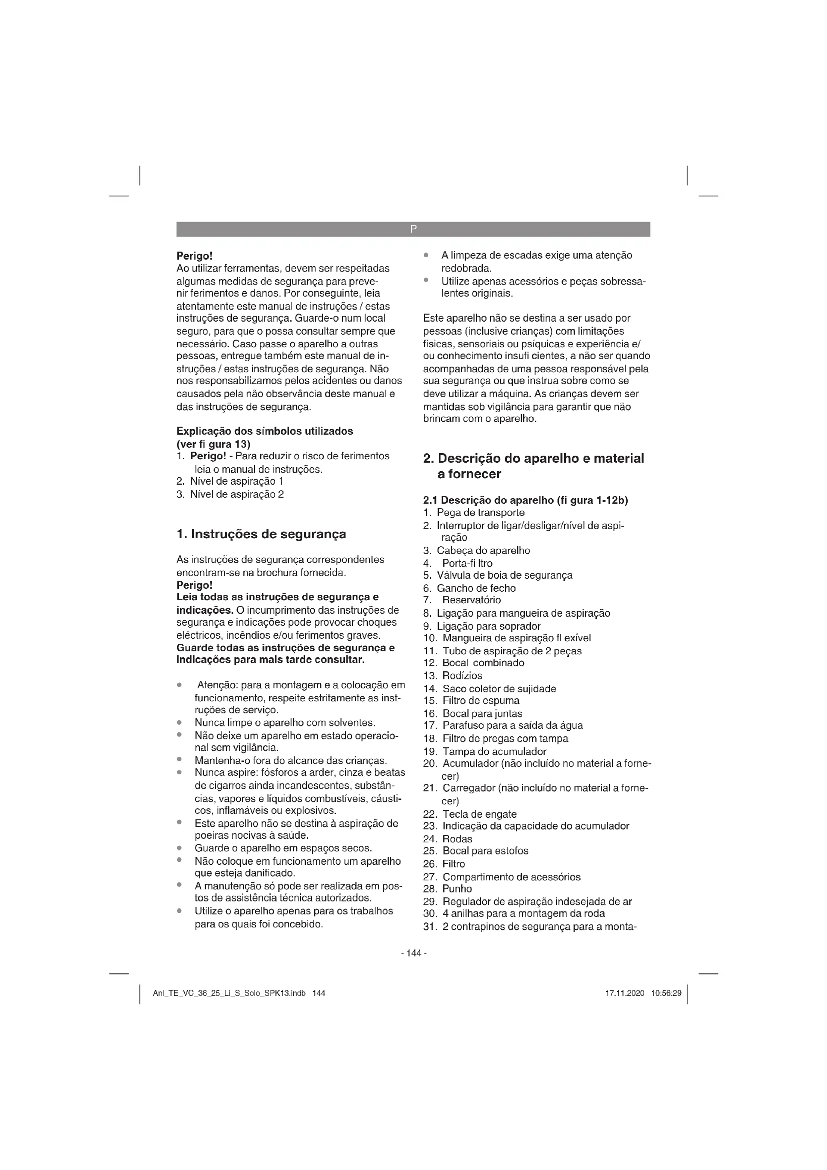 e o pack de baterias para o nosso serviço de assistência técnica. Para o envio correto, contacte o nosso ser- viço de assistência técnica ou o ponto de venda onde adquiriu o aparelho. Ao enviar ou eliminar baterias ou o aparelho sem fi o, certifi que-se de que estes são emba- lados individualmente em sacos de plástico para evitar curto-circuitos e incêndios! Tendo em vista uma longa vida útil do pack de baterias, deve providenciar o seu recarregamento atempado. Isto é absolutamente necessário se Anl_TE_VC_36_25_Li_S_Solo_SPK13.indb 146Anl_TE_VC_36_25_Li_S_Solo_SPK13.indb 146 17.11.2020 10:56:2917.11.2020 10:56:29P