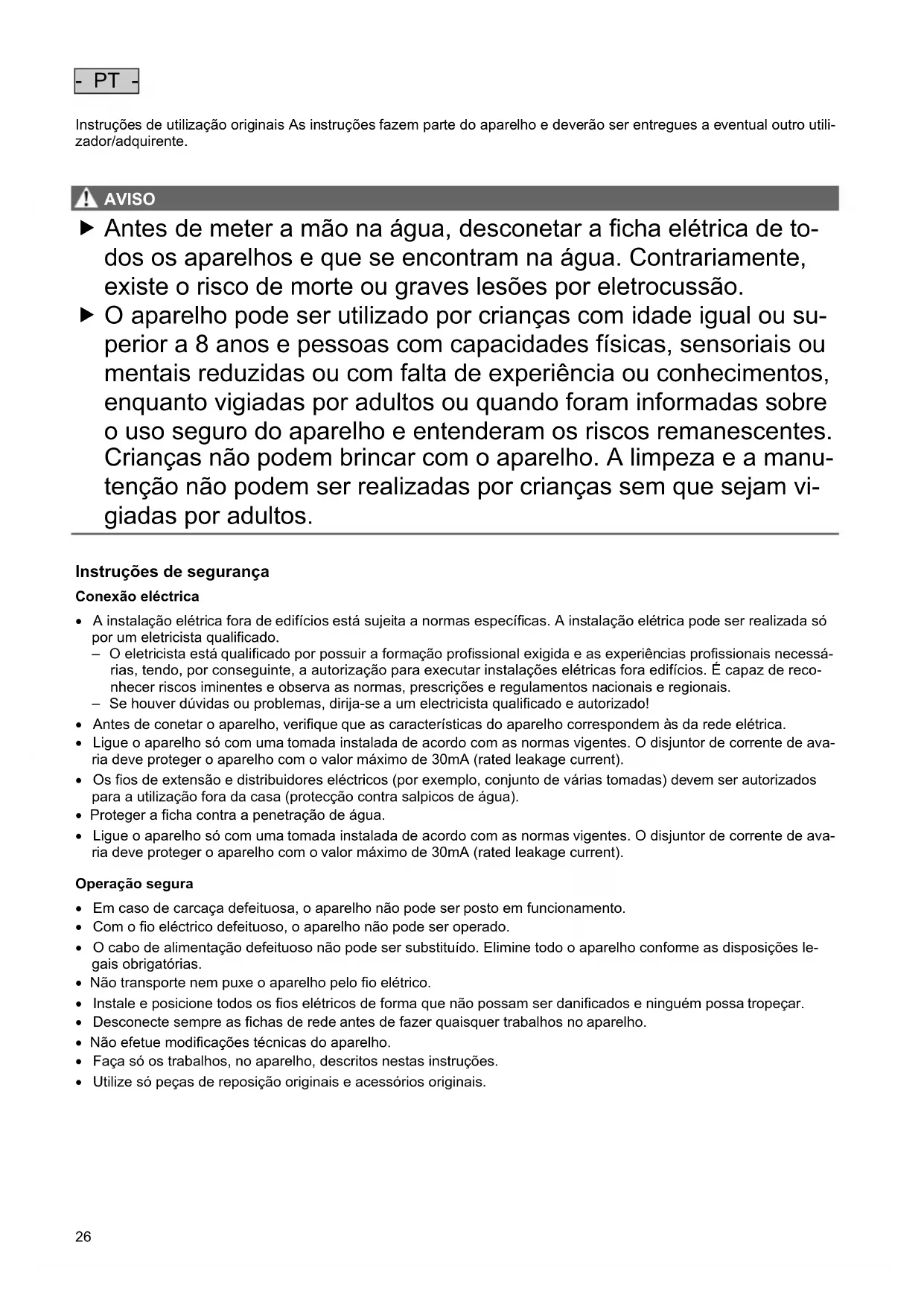 AVISO AVISO Antes de meter a mão na água, desconetar a ficha elétrica de to- dos os aparelhos e que se encontram na água. Contrariamente, existe o risco de morte ou graves lesões por eletrocussão. O aparelho pode ser utilizado por crianças com idade igual ou su- perior a 8 anos e pessoas com capacidades físicas, sensoriais ou mentais reduzidas ou com falta de experiência ou conhecimentos, enquanto vigiadas por adultos ou quando foram informadas sobre o uso seguro do aparelho e entenderam os riscos remanescentes. Crianças não podem brincar com o aparelho. A limpeza e a manu- tenção não podem ser realizadas por crianças sem que sejam vi- giadas por adultos.