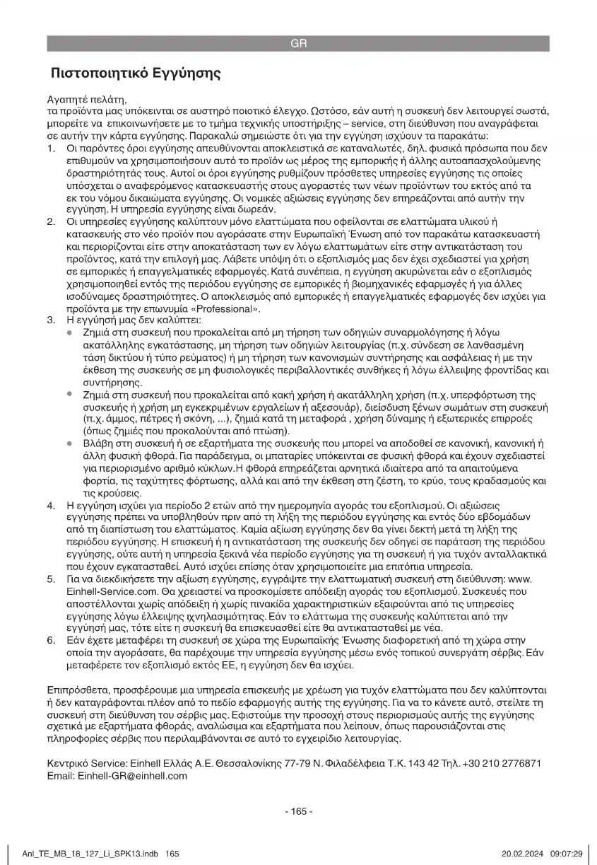 o aparelho, o serviço de garantia será prestado por um parceiro de serviço de assistência técnica local. A transferência para fora da União Europeia faz cessar os direitos de garantia. Naturalmente, também teremos todo o gosto em efetuar reparações que não estão, ou deixaram de estar, abrangi- das pelo serviço de garantia. Nesse caso, terá de suportar os custos da reparação. Para este efeito, deverá enviar o aparelho para a morada do nosso serviço de assistência técnica. Para peças de desgaste, consumíveis e em falta, consulte as restrições desta garantia, de acordo com as informações do serviço de assistência técnica deste manual de instruções. Fiador/ Serviço: Einhell Portugal Lda., Rua da Aldeia, 225, 4410-459 Arcozelo (VNG) Anl_TE_MB_18_127_Li_SPK13.indb 176Anl_TE_MB_18_127_Li_SPK13.indb 176 20.02.2024 09:07:3120.02.2024 09:07:31HR/BIH