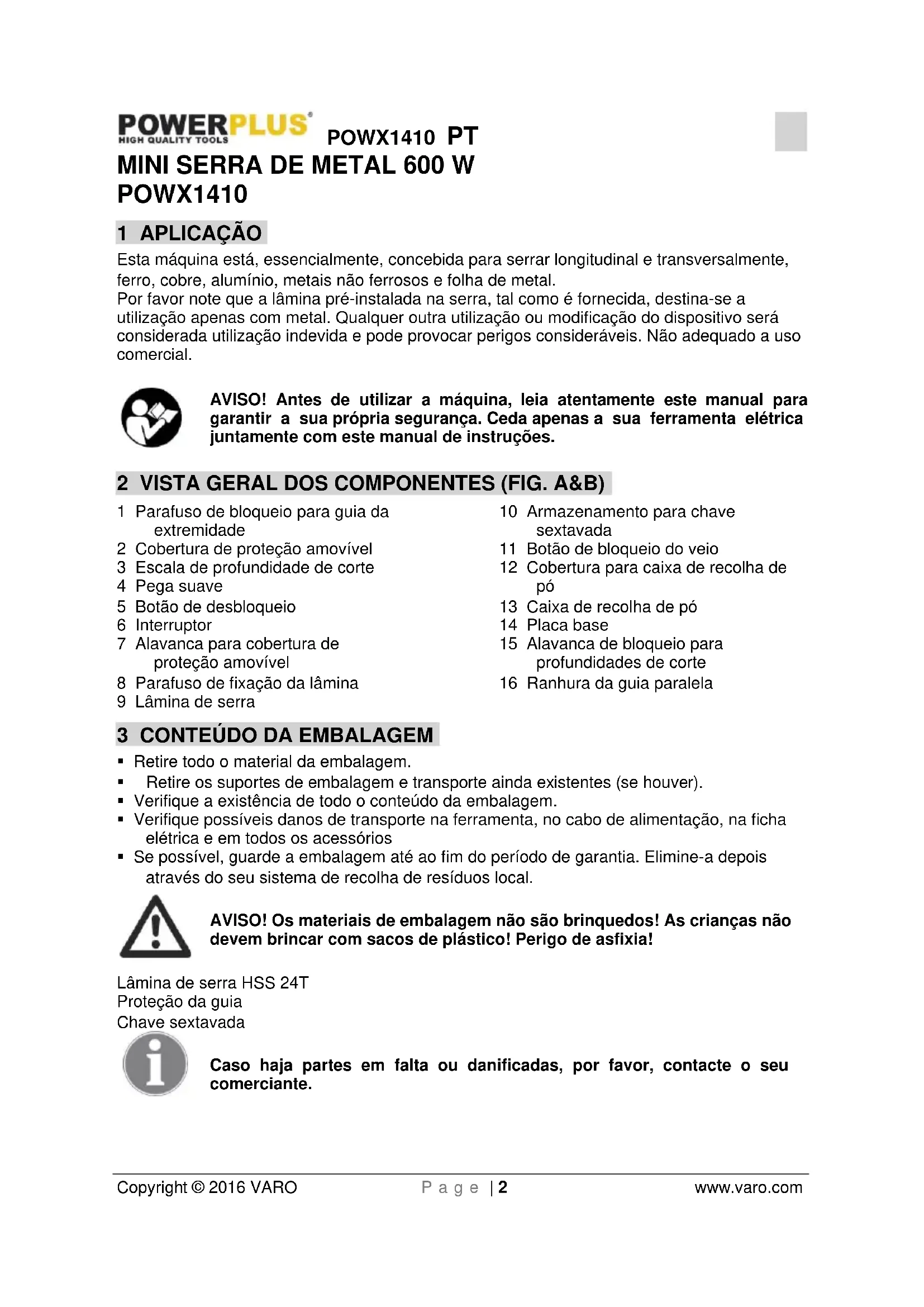 VARO N.V. – Joseph Van Instraat 9 – BE2500 Lier – Bélgica, declara que, Designação do aparelho: Mini serra de metal 600 W Marca: POWERplus Modelo nº.: POWX1410 se encontra em conformidade com os requisitos essenciais e outras provisões relevantes das Diretivas Comunitárias aplicáveis, com base na aplicação das normas Europeias harmonizadas. Qualquer alteração não autorizada do equipamento anula esta declaração. Diretivas Europeias (incluindo, se aplicável, as respetivas emendas até à data de assinatura): 2011/65/EU 2006/42/EC 2014/30/EU Normas Europeias harmonizadas (incluindo, se aplicável, as respetivas emendas até à data de assinatura): EN60745-1 : 2009 EN60745-2-5 : 2010 EN55014-1 : 2006 EN55014-2 : 1997 EN61000-3-2 : 2014 EN61000-3-3 : 2013 Detentor da Documentação Técnica: Philippe Vankerkhove, VARO – Vic. Van Rompuy N.V. O signatário atua em nome da administração da empresa, Philippe Vankerkhove Assuntos Regulamentares – Gestor de Conformidade 28/04/2016POWX1410 NO Copyright © 2016 VARO S i d e | 1 www.varo.com 1 BRUKSOMRÅDE ............................................................................. 2