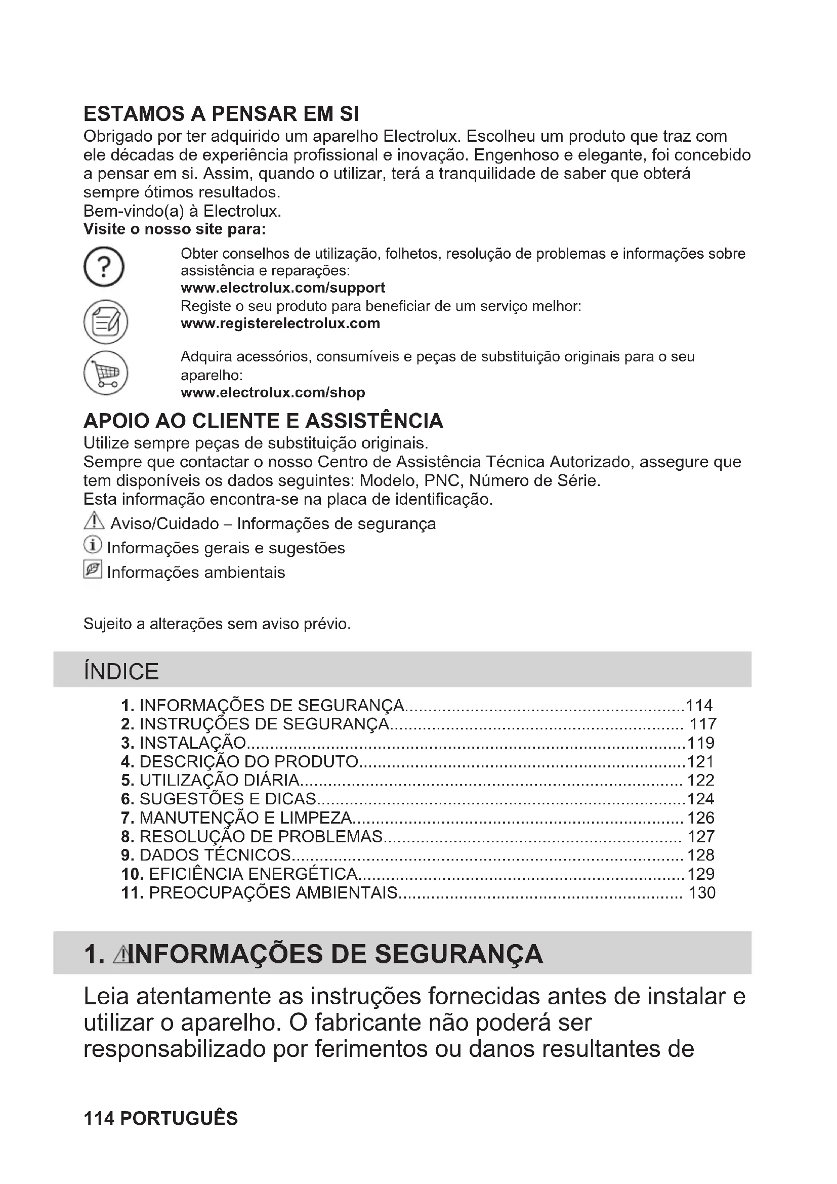 Obrigado por ter adquirido um aparelho Electrolux. Escolheu um produto que traz comele décadas de experiência profissional e inovação. Engenhoso e elegante, foi concebidoa pensar em si. Assim, quando o utilizar, terá a tranquilidade de saber que obterásempre ótimos resultados.Bem-vindo(a) à Electrolux.Visite o nosso site para:Obter conselhos de utilização, folhetos, resolução de problemas e informações sobreassistência e reparações:www.electrolux.com/supportRegiste o seu produto para beneficiar de um serviço melhor:www.registerelectrolux.comAdquira acessórios, consumíveis e peças de substituição originais para o seuaparelho:www.electrolux.com/shop