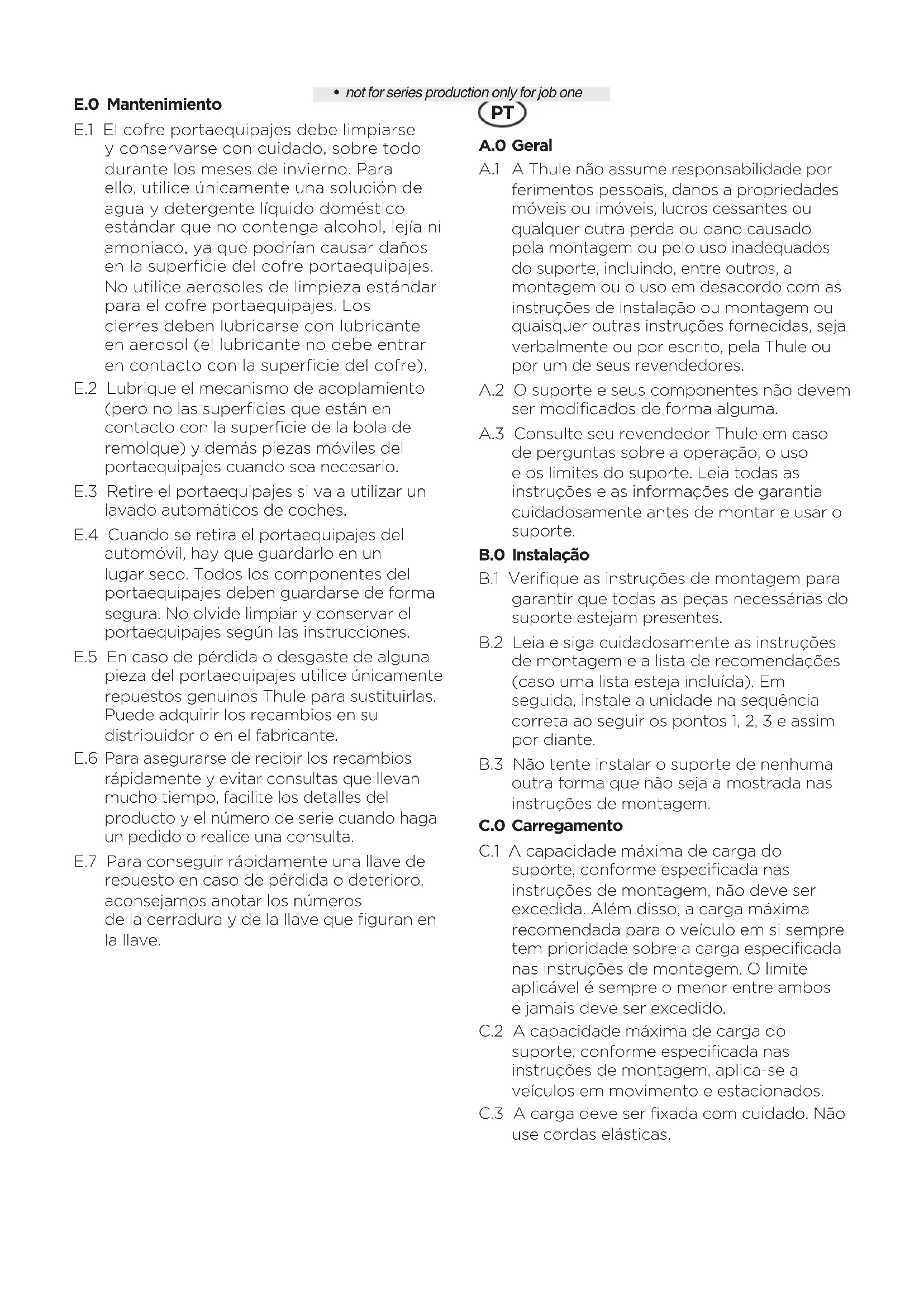 - 10 graus acima e 5 graus abaixo do eixo horizontal Se esses limites não forem atendidos, uma luz de freio adicional opcional deverá ser instalada. A legislação nacional de trânsito deverá ser levada em consideração durante o uso do suporte. C.7 Guarde as instruções de montagem e de segurança e (se aplicável) o documento de Homologação Europeia de Veículos no veículo onde o suporte estiver montado. D.0 Características de condução e regulamentações D.1 Este produto não foi aprovado e não deve ser usado em condições de condução off-road. Adapte a velocidade de direção às condições da via e da carga sendo transportada. Verifique regularmente o aperto da carga. D.2 O condutor do veículo é o único responsável por garantir que o suporte esteja em prefeitas condições e que o suporte e a carga estejam presos firmemente (mesmo se instalados por terceiros). D.3 Toda vez que o suporte for usado, verifique se ele permanece preso firmemente após dirigir por uma distância curta (50 km) e, em seguida, em intervalos regulares. Se você observar algum ruído fora do normal, movimento da carga e/ ou do suporte, comportamento diferente do veículo ou outras condições fora do normal, pare assim que possível e verifique se o suporte e a carga estão presos corretamente e de acordo com as instruções de montagem. D.4 Substitua imediatamente quaisquer peças danificadas ou desgastadas do suporte. Durante o transporte, todas as alavanca e todos os parafusos e/ou porcas deverão ser/permanecer apertados de acordo com as instruções. D.5 Suportes equipados com fechos deverão ser sempre travados. As chaves devem ser removidas e mantidas no interior do veículo durante o transporte. D.6 Observe que as características de condução do veículo e o comportamento de frenagem (inclusive em curvas) poderá mudar e que o veículo poderá tornar-se vulnerável a ventos laterais quando o suporte estiver instalado. D.7 Dependendo do modelo do suporte, as lanternas traseiras poderão ser obstruídas. Se esse for o caso, e se o suporte não possuir lanternas integradas, uma placa de luzes externa deve ser instalada. D.8 Uma placa de licença adicional poderá ser necessária. Ela deverá ser fixada no local apropriado do suporte de acordo com alegislação local. D.9 A velocidade do veículo deverá ser sempre ajustada à carga sendo transportada e às condições de direção atuais, como tipo e qualidade do pavimento, condições de vento, intensidade do tráfego e limites de velocidade aplicáveis. No entanto, em nenhuma circunstância ela deverá exceder 130 km/h. Os limites de velocidade aplicáveis e outras normas de tráfego devem ser sempre observados. D.10 Dirija lentamente ao passar sobre lombadas/quebra-molas. Velocidade máxima de 10 km/h. D.11 Observe que poderá haver ruído causado pelo vento durante o transporte em função do veículo e da carga sendo transportada. D.12 Por questões de economia de combustível e impacto ambiental, bem como de segurança dos demais usuários das vias, o suporte deverá ser removido do veículo quando não estiver em uso. D.13 Antes da partida, o funcionamento das luzes deve ser inspecionado. Ao usar luzes de neblina no suporte, certifique-se de que a luz de neblina do veículo não seja ligada ao mesmo tempo. A luz de neblina do veículo em geral apaga automaticamente quando o veículo detecta que o plugue foi conectado. Verifique se esse é o caso.195561211001 D.14 Verifique a distância e a área exposta no suporte atrás do cano de descarga para evitar danos ao suporte. O cano de descarga e/ou os gases de exaustão quentes poderiam danificar os componentes do suporte. Em alguns modelos de veículos, uma extensão de cano de descarga deve ser usada. Consulte seu revendedor Thule em caso de dúvidas sobre os requisitos aplicáveis ao seu veículo. D.15 Verifique regularmente o aperto da carga. D.16 Certifique-se de que o bagageiro de teto esteja fechado e trancado e que a chave seja removida do fecho antes de começar a dirigir. D.17 O comprimento e/ou a altura total do veículo podem aumentar com o suporte montado. Tome muito cuidado ao dirigir de marcha à ré e/ou ao entrar em garagens, balsas, etc. E.0 Manutenção E.1 O bagageiro de teto deve ser limpo e tratado com cuidado, em especial nos meses deinverno. Para isso, use apenas uma solução composta por água e detergente neutro, sem álcool, alvejante ou aditivos com amônia. Caso contrário, a superfície do bagageiropoderá sofrer danos. Não use sprays para limpeza interna do veículo para limpar obagageiro. Os fechos devem ser lubrificados com lubrificante em spray (evite o contato de lubrificantes com a superfície plástica do bagageiro). E.2 Lubrifique o mecanismo de acoplamento (mas não as superfícies em contato com a bola de engate) e as outras partes móveis do suporte quando necessário. E.3 Remova o suporte antes de lavar o veículo em um lavador automático E.4 Quando o suporte é removido do veículo, ele deve ser armazenado em um local seco. Todos os componentes do suporte devem ser armazenados em segurança. Lembre- se de limpar emanter o suporte de acordo com as instruções. E.5 Em caso de perda ou desgaste dos componentes do suporte, use apenas peças de reposição originais Thule. As peças de reposição podem ser compradas junto ao seu revendedor ou ao fabricante. E.6 Para garantir o recebimento rápido das peças de reposição, epara evitar consultas demoradas, forneça os detalhes do produto relevante e o número de série ao efetuar um pedido ou submeter uma consulta. E.7 De modo a garantir a substituição mais rápida possível de chaves perdidas ou com defeito, tome nota dos números da fechadura eda chave, os quais pode encontrar nos respectivos componentes.5561211001 © Thule Group 2022. All rights reserved.Thule Inc. • 42 Silvermine Road • Seymour, CT 06483Thule Canada Inc. • 710 Bernard • Granby QC J2J 0H6North American Consum