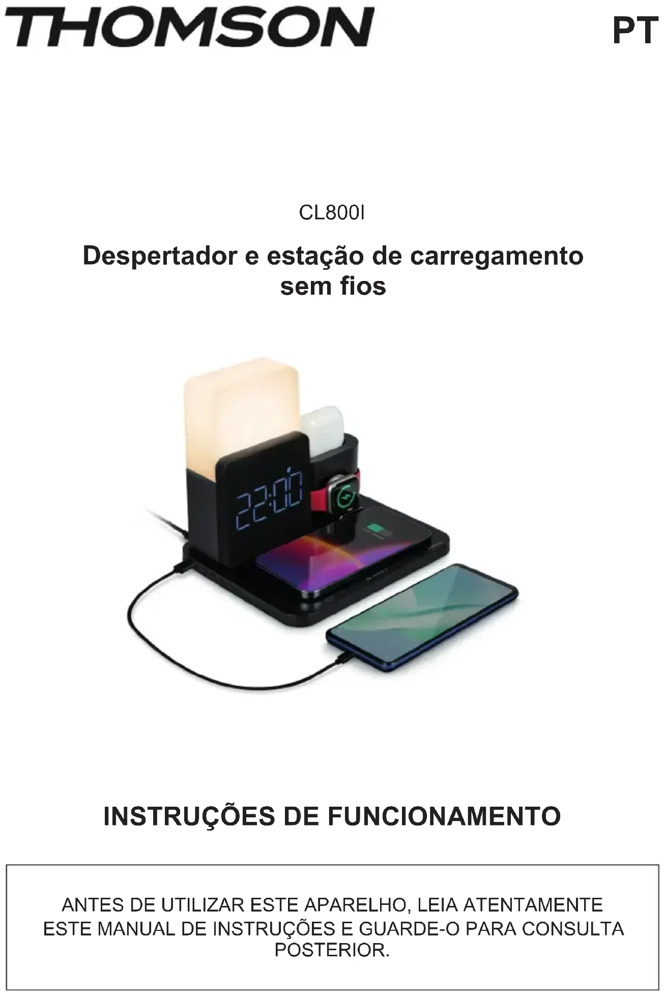 de azul para branco ATENÇÃO: não colocar peças e/ou objetos metálicos sobre a placa de carregamento sem os para evitar qualquer efeito de sobreaquecimento nos objetos metálicos. Instruções para o funcionamento da lâmpada LED Pressionar 1 vez para ligar a luz branco quente. 2 vezes para a luz branco frio. 3 vezes para a luz branco brilhante. Pressionar 4 vez para desligar a luz. Independentemente da cor da luz, premir longamente para regular a luminosidade. Em modo alarme, premir brevemente para ativar o Snooze, premir longamente para desligar o alarme. Em modo Snooze, premir longamente para cancelar o Snooze.- PT 58 - Dispositivos abrangidos Ee produto suporta um carregamento sem os rápido, em conformidade com a norma de carregamento sem os; efetua uma transmissão de alimentação sem os a curta diância através de indução magnética. Ee aparelho suporta todos os dispositivos de carregamento sem os que eão em conformidade com a norma. Aspetos importantes Não utilizar ou armazenar o produto sob a luz direta do sol ou em temperaturas elevadas durante um período prolongado. Não carregar demasiado perto de cartões magnéticos, suportes de gravação magnética e inrumentos de precisão. Não desmontar ou modicar ee produto. Não tocar no adaptador de corrente com as mãos molhadas. Manter ee produto afaado da água ou de outros líquidos. Para limpar o produto, desligar a alimentação elétrica. Intervalo de temperaturas do ambiente de funcionamento do produto: de -20 a 45 °C Especificações técnicas Número do modelo: CL800I Alimentação: CC 9 V/2,7 A Eciência de carregamento: 75 % Saída sem os: 5 W/7,5 W/10 W Saída USB-A: CC 5 V/1 A Saída USB-A: CC 5 V/0,75 A (eojo de arrumação) Saída USB-C: CC 5 V/0,75 A (eojo de arrumação) Bateria de reserva do despertador: 1 x CR2032 3 V Dimensões do produto: 202 x 170 x 174 mm- PT 59 - Proteção do ambiente O seu produto foi concebido e fabricado com materiais e componentes de elevada qualidade, que podem ser reciclados e reutilizados. Importa chamar a atenção para os aspetos ambientais da eliminação das baterias. Quando o símbolo do caixote do lixo com uma cruz eiver presente num produto, isso signica que o produto eá abrangido pela Diretiva Europeia 2002/96/CE. Informe-se sobre o siema local de recolha seletiva de produtos elétricos e eletrónicos. Aja em conformidade com as regras locais e não elimine os seus produtos antigos juntamente com o lixo doméico. A eliminação dee produto ajuda a evitar potenciais consequências negativas para o meio ambiente e para a saúde humana. Informações complementares