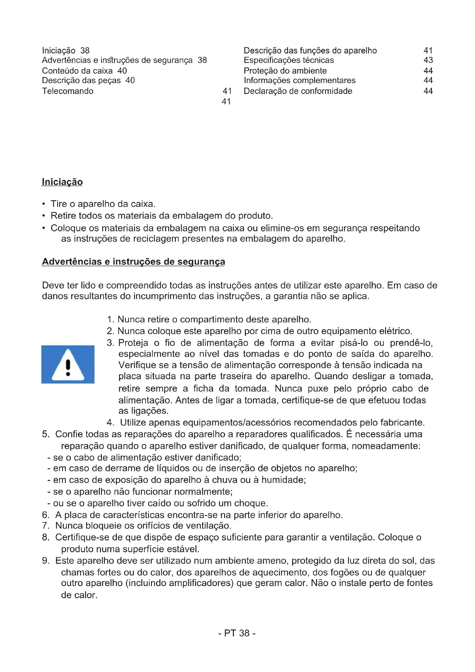 chamas fortes ou do calor, dos aparelhos de aquecimento, dos fogões ou de qualquer outro aparelho (incluindo amplicadores) que geram calor. Não o inale perto de fontes de calor. Iniciação 38 Advertências e inruções de segurança 38 Conteúdo da caixa 40 Descrição das peças 40 Telecomando 41