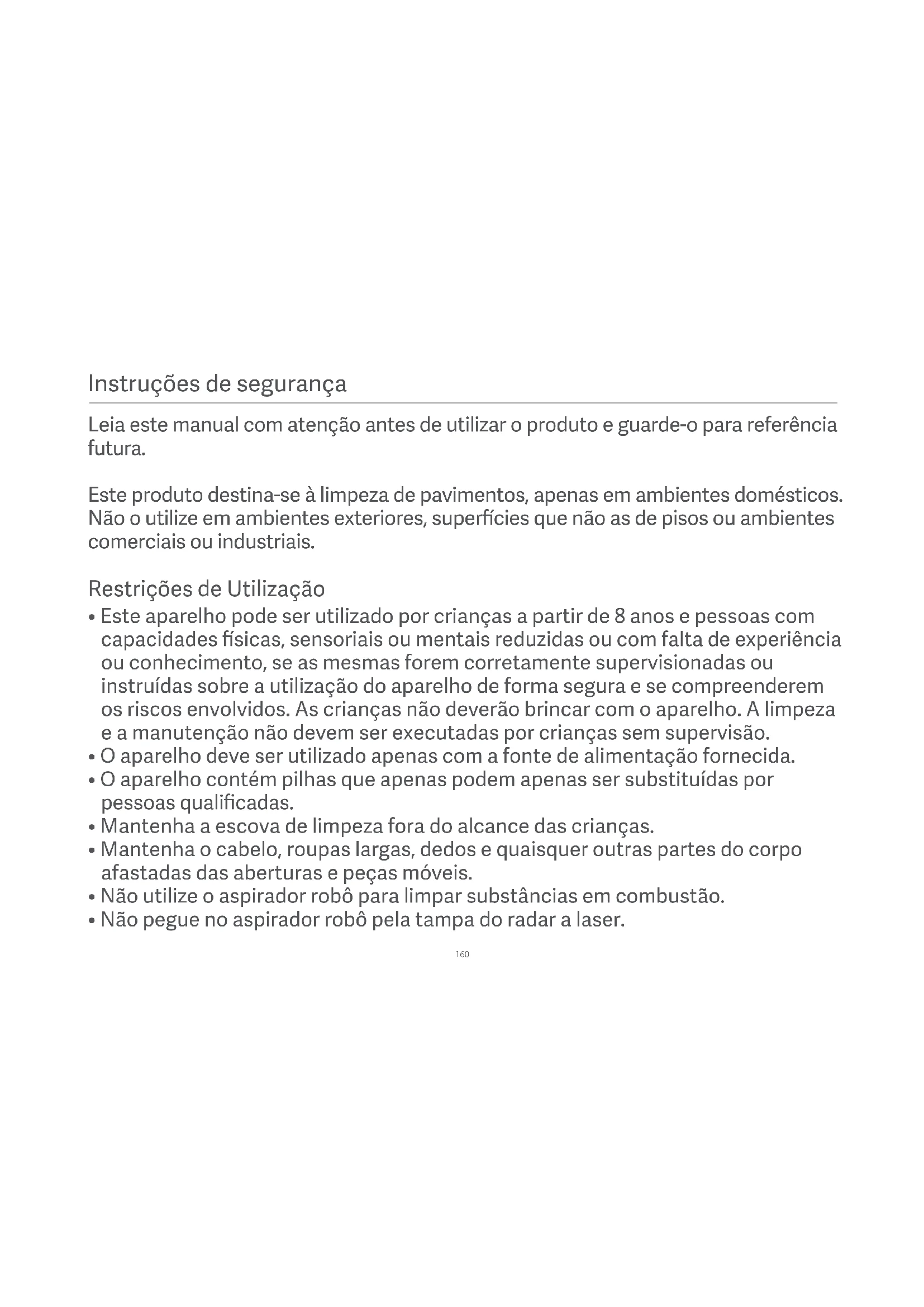 - Não pegue no aspirador robô pela tampa do radar a laser. Leia este manual com atenção antes de utilizar o produto e guarde-o para referência futura. Este produto destina-se à limpeza de pavimentos, apenas em ambientes domésticos. Não o utilize em ambientes exteriores, supercies que não as de pisos ou ambientes comerciais ou industriais.161