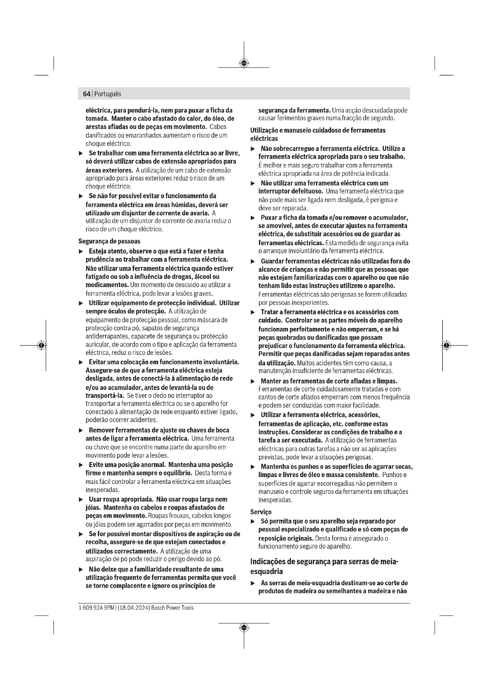 – Fixe os pés da ferramenta elétrica com grampos convencionais à superfície de trabalho. Montagem numa mesa de trabalho Bosch As mesas de trabalho GTA da Bosch oferecem firmeza à ferramenta elétrica, sobre qualquer solo, devido aos pés de altura ajustável. As mesas de trabalho possuem bases de apoio para o apoio de peças longas. u Ler todas as indicações de aviso e instruções fornecidas com a mesa de trabalho. O desrespeito das indicações de aviso e das instruções pode causar choque elétrico, queimaduras e/ou ferimentos graves. u Montar corretamente a mesa de trabalho, antes de montar a ferramenta elétrica. É importante que a montagem seja perfeita, para evitar o risco de desmoronamento. – Monte a ferramenta elétrica na posição de transporte sobre a mesa de trabalho. Instalação flexível (não recomendada!) (ver figura B3) Se excecionalmente não for possível montar a ferramenta elétrica sobre uma superfície de trabalho plana e estável, pode usar como auxiliar uma proteção contra tombamento. u Sem a proteção contra tombamento a ferramenta elétrica não está segura e pode tombar especialmente ao serrar ângulos de meia-esquadria máximos horizontais e/ou verticais. – Rodar a proteção contra tombamento (20) para dentro ou para fora até que a ferramenta elétrica fique direita sobre a superfície de trabalho. Aspiração de pó/de aparas Pós de materiais como por exemplo, tintas que contém chumbo, alguns tipos de madeira, minerais e metais, podem ser nocivos à saúde. O contacto ou a inalação dos pós pode provocar reações alérgicas e/ou doenças nas vias respiratórias do utilizador ou das pessoas que se encontrem por perto. Certos pós, como por exemplo pó de carvalho e faia são considerados como sendo cancerígenos, especialmente Bosch Power Tools 1 609 92A 9PM | (18.04.2024)70 | Português quando juntos com substâncias para o tratamento de madeiras (cromato, produtos de proteção da madeira). Material que contém asbesto só deve ser processado por pessoal especializado. – Se possível deverá usar um dispositivo de aspiração de pó apropriado para o material. – Assegurar uma boa ventilação do local de trabalho. – É recomendável usar uma máscara de proteção respiratória com filtro da classe P2. Observe as diretivas para os materiais a serem processados, vigentes no seu país. u Evite a acumulação de pó no local de trabalho. Pós podem entrar levemente em ignição. A aspiração de pó/de aparas pode ser bloqueada por pó, aparas ou por estilhaços da peça a ser trabalhada. – Desligue a ferramenta elétrica e retire a ficha de rede da tomada. – Aguarde até que o disco de serra esteja completamente parado. – Verifique a causa do bloqueio e elimine-a. Aspiração integrada (verfiguraC) Para a fácil recolha das aparas deverá utilizar o saco do pó(37) fornecido. – Coloque o punho de transporte (3) na vertical. – Encaixe e rode o saco do pó (37) no adaptador de aspiração (50), de forma a que o pino do saco do pó engate no entalhe no adaptador de aspiração. Ao serrar, o saco do pó não deve entrar em contacto com as peças móveis do aparelho. Esvazie o saco do pó a tempo. u Verifique e limpe o saco de pó após cada utilização. u Para evitar perigo de incêndio, deverá remover o saco de pó para serrar alumínio. Aspiração externa Para a aspiração também é possível ligar ao adaptador de aspiração (50) uma mangueira de aspirador (Ø 35 mm). – Ligue a mangueira do aspirador ao adaptador de aspiração (50). O aspirador de pó deve ser apropriado para o material a ser trabalhado. Utilize um aspirador especial para aspirar pó que seja extremamente nocivo à saúde, cancerígeno ou seco. Substituir o disco de serra (ver figura D1−D4) u Antes de todos trabalhos na ferramenta elétrica deverá puxar a ficha de rede da tomada. u Para a montagem do disco de serra é necessário usar luvas de proteção. Há perigo de ferimentos em caso de contacto com a lâmina de serra. Só utilizar discos de serra com uma máxima velocidade admissível superior à velocidade da marcha em vazio da ferramenta elétrica. Utilize apenas discos de serra que correspondam aos dados característicos indicados neste manual de instrução e que sejam controlados conforme EN847‑1 e respetivamente marcados. Utilize apenas discos de serra recomendados pelo fabricante desta ferramenta elétrica e adequados para o material com que deseja trabalhar. Desta forma, evita-se o sobreaquecimento dos dentes de serra ao serrar. Desmontar o disco de serra – Coloque a ferramenta elétrica na posição de trabalho. – Gire a cobertura de proteção pendular(12) para trás e mantenha-a nesta posição. – Rode o parafuso de sextavado interior(51) com a chave sextavada interior(6mm) (43) e pressione em simultâneo o bloqueio do veio(33), até este engatar. – Mantenha o bloqueio do veio(33) pressionado e rode o parafuso de sextavado interior(51) para a direita (rosca à esquerda!). – Retire o flange de aperto(52). – Retire o disco de serra(32). – Reconduzir lentamente a tampa de proteção pendular para baixo. Montar o disco de serra u Durante a montagem, deverá observar que o sentido de corte dos dentes (sentido da seta sobre a lâmina de corte) coincida com o sentido da seta sobre a capa de proteção! Se necessário, deverá limpar todas as partes antes de serem montadas. – Gire a cobertura de proteção pendular(12) para trás e mantenha-a nesta posição. – Coloque o novo disco de serra no flange de aperto interior(53). – Coloque o flange de aperto(52) e o parafuso de sextavado interior(51). Pressione o bloqueio do veio(33) até este engatar, e aperte o parafuso de sextavado interior rodando para a esquerda. – Reconduzir lentamente a tampa de proteção pendular para baixo. Funcionamento u Antes de todos trabalhos na ferramenta elétrica deverá puxar a ficha de rede da tomada. Proteção de transporte (