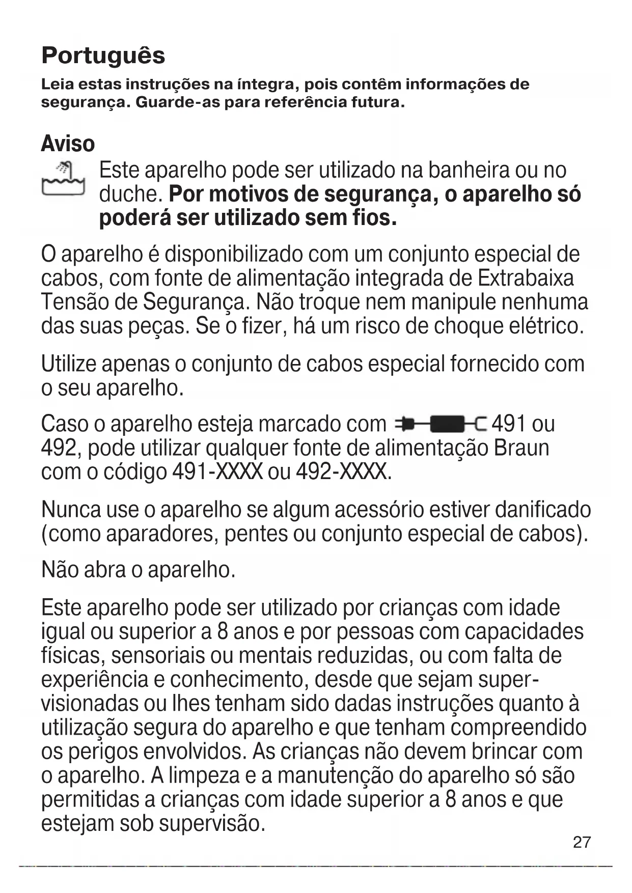 - Para manter o bom funcionamento dos acessórios, lubrifique frequentemente o aparador e as lâminas com uma gota de óleo lubrificante (não incluído). Aviso ambiental Este produto contém uma bateria e/ou resíduos elétricos recicláveis. Com o intuito de proteger o ambiente, não elimine o produto junta- mente com o lixo doméstico. Entregue-o num dos pontos de recolha de resíduos elétricos à disposição no seu país. Sujeito a alterações sem aviso prévio. Garantia Os nossos produtos dispõem de uma garantia de 2 anos a partir da data de compra. Qualquer defeito do aparelho imputável, quer aos materiais, quer ao fabrico, que torne necessário reparar, substituir peças ou trocar de aparelho dentro de período de garantia não terá custos adicionais. A garantia não cobre avarias por utilização indevida, funcionamento a voltagem diferente da indicada, ligação a uma tomada de corrente elétrica incorreta, rutura, utilização ou desgaste normal, defeitos com um efeito insignificante no valor ou no funcionamento do produto. 91835113_MGK_7021-7020-7920-5080_MN_ANZ.indd 3091835113_MGK_7021-7020-7920-5080_MN_ANZ.indd 30 13.04.18 10:3413.04.18 10:34 Business Use - P&G AUTHORIZED POA-00043782 Rev 001 Effective Date 2018-04-18 Printed 2019-02-27 Page 30 of 6431 A garantia perderá o seu efeito no caso de serem efetuadas reparações por pessoas não autorizadas ou se não forem utilizados acessórios originais Braun. A garantia só é válida se a data de compra for confirmada pela apresentação da fatura ou documento de compra correspondente. Esta garantia é válida para todos os países onde este produto seja distribuído pela Braun ou por um distribuidor Braun autorizado. No caso de reclamação ao abrigo de garantia, dirija-se ao Serviço de Assistência Técnica Oficial Braun mais próximo: www.service.braun.com. Só para Portugal Apoio ao consumidor: Para localizar o seu Serviço Braun mais próximo, no caso de surgir alguma dúvida relativamente ao funcionamento deste produto, contacte-nos por favor pelo telefone 808 20 00 33. 91835113_MGK_7021-7020-7920-5080_MN_ANZ.indd 3191835113_MGK_7021-7020-7920-5080_MN_ANZ.indd 31 13.04.18 10:3413.04.18 10:34 Business Use - P&G AUTHORIZED POA-00043782 Rev 001 Effective Date 2018-04-18 Printed 2019-02-27 Page 31 of 6432 Italiano Leggere attentamente queste istruzioni, contengono informazioni di sicurezza. Conservarle per una consultazione futura. Attenzione Questo apparecchio è adatto per un utilizzo nella vasca da bagno o sotto la doccia. Per ragioni di sicurezza può essere utilizzato solo senza fili. L’apparecchio è fornito di uno speciale cavo di alimentazione dotato di un sistema integrato di sicurezza a basso voltag- gio. Non sostituire o manomettere nessuna sua parte. In caso contrario, sussiste il rischio di scosse elettriche. Utilizzare solo il cavo speciale fornito con l’apparecchio. Se l’apparecchio è contrassegnato da 491 o 492, può essere utilizzato con qualsiasi alimentazione codi- ficata Braun 491-XXXX o 492-XXXX. Non usare l’apparecchio con rifinitori, pettini o cavi speciali di alimentazione danneggiati. Non aprire l’apparecchio! L’apparecchio può essere utilizzato da bambini di almeno 8 anni e da persone con capacità fisiche, sensoriali o mentali ridotte oppure prive di esperienza e conoscenze, purché siano supervisionati o purché abbiano ricevuto istruzioni sull’utilizzo corretto dell’apparecchio e siano a conoscenza dei rischi derivanti dall’utilizzo. I bambini non devono giocare con l’apparecchio. La pulizia e la manutenzione dell’appa- recchio non devono essere effettuate da bambini di età inferiore a 8 anni e senza la supervisione di un adulto. 91835113_MGK_7021-7020-7920-5080_MN_ANZ.indd 3291835113_MGK_7021-7020-7920-5080_MN_ANZ.indd 32 13.04.18 10:3413.04.18 10:34 Business Use - P&G AUTHORIZED POA-00043782 Rev 001 Effective Date 2018-04-18 Printed 2019-02-27 Page 32 of 6433 Descrizione 1a Pettine da barba estraibile (3–11 mm con intervalli di 2 mm) 1b Pettine da barba estraibile (13–21 mm con intervalli di 2 mm) 1c Pulsante di rilascio dei pettini estraibili 1d Pettine fisso 1 (1 mm) 1e Pettine fisso 2 (2 mm) 2a Testina del rifinitore 2b Testina del rifinitore naso e orecchie* 2c Testina del rifinitore di precisione* 2d Testina radente corpo* 2e Mini testina radente a lamina* 3 Interruttore acceso/spento 4 Indicatore di ricarica 5 Presa di corrente 6 Set di cavi speciali (il design può essere diverso) 7 Base di ricarica*