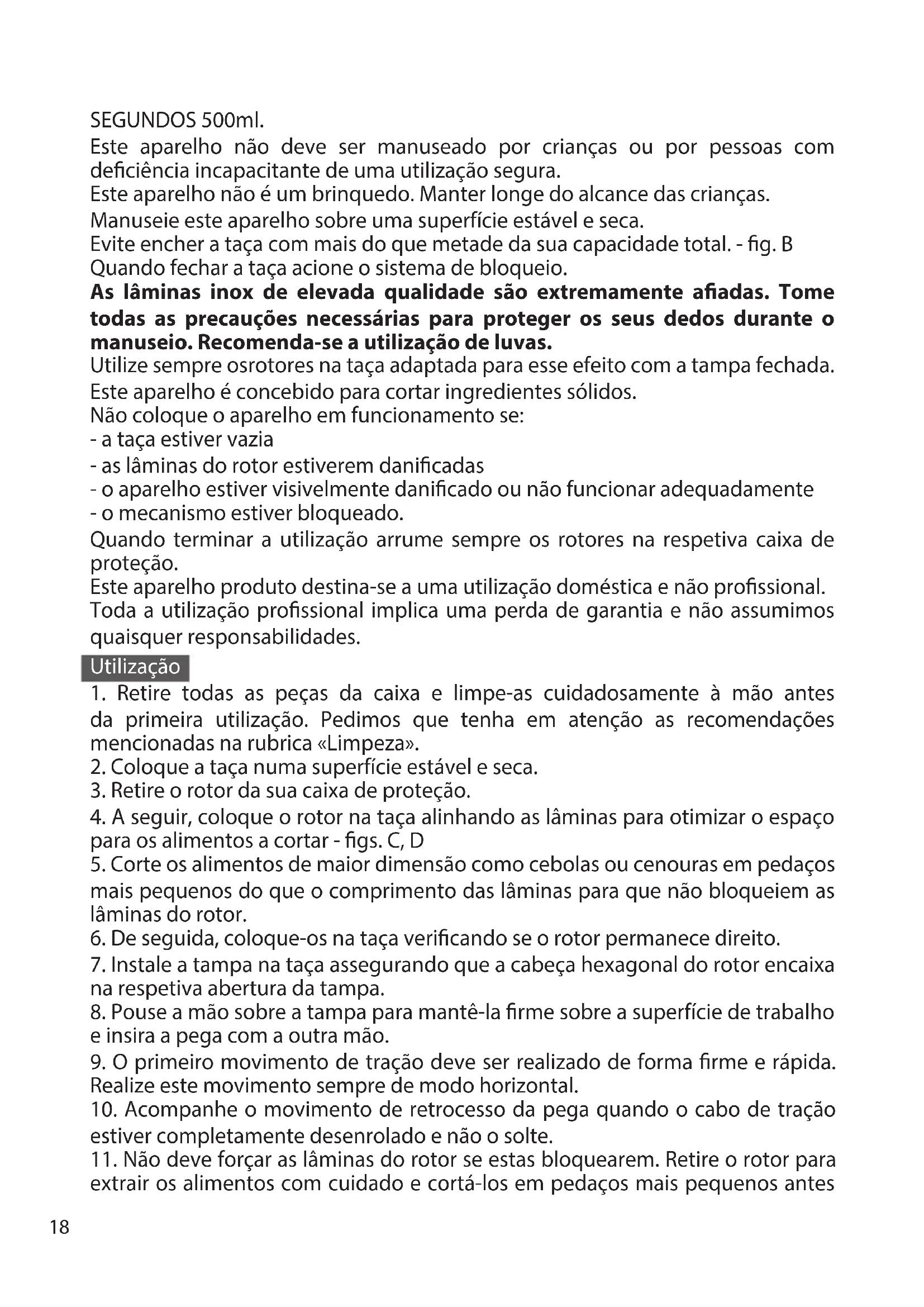 Agradecemos a sua aquisição da Picadora Tefal® 5 segundos Esta picadora manual inclui: g. A - 1 vaso antideslizante con capacidad de 500ml - 1 tapa con el mecanismo de tracción incorporado y un sistema de bloqueo - 1 rotor patentado compuesto por dos cuchillas de acero inoxidable independientes. Instruções de utilização A m de garantir um resultado ótimo, encha a taça até metade com pedaços de alimentosx previamente cortados e sem pele. Não utilizar o aparelho para cortar carne com osso porque tal danicaria permanentemente as lâminas. Instruções de segurança Estas lâminas devem ser utilizadas exclusivamente com a PICADORA Tefal® 5 CST-13-17-000497D_CHOPPER 500 Use&care.indd 17 27/01/2020 15:3318 SEGUNDOS 500ml. Este aparelho não deve ser manuseado por crianças ou por pessoas com deciência incapacitante de uma utilização segura. Este aparelho não é um brinquedo. Manter longe do alcance das crianças. Manuseie este aparelho sobre uma superfície estável e seca. Evite encher a taça com mais do que metade da sua capacidade total. - g. B Quando fechar a taça acione o sistema de bloqueio. As lâminas inox de elevada qualidade são extremamente aadas. Tome todas as precauções necessárias para proteger os seus dedos durante o manuseio. Recomenda-se a utilização de luvas. Utilize sempre osrotores na taça adaptada para esse efeito com a tampa fechada. Este aparelho é concebido para cortar ingredientes sólidos. Não coloque o aparelho em funcionamento se: - a taça estiver vazia - as lâminas do rotor estiverem danicadas - o aparelho estiver visivelmente danicado ou não funcionar adequadamente - o mecanismo estiver bloqueado. Quando terminar a utilização arrume sempre os rotores na respetiva caixa de proteção. Este aparelho produto destina-se a uma utilização doméstica e não prossional. Toda a utilização prossional implica uma perda de garantia e não assumimos quaisquer responsabilidades. Utilização