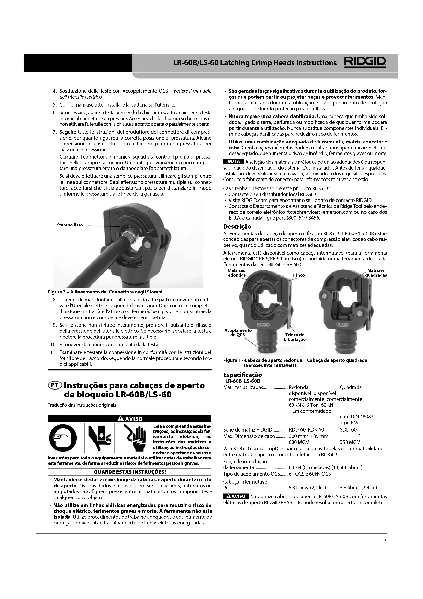 - Não utilize em linhas elétricas energizadas para reduzir o risco de choque elétrico, ferimentos graves e morte. A ferramenta não está isolada. Utilize procedimentos de trabalho adequados e equipamento de proteção individual ao trabalhar perto de linhas elétricas energizadas.LR-60B/LS-60 Latching Crimp Heads Instructions