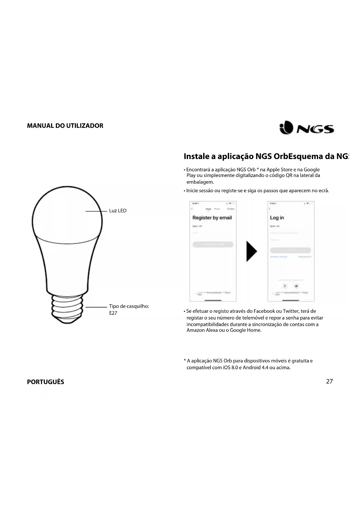 - A aplicação NGS Orb para dispositivos móveis é gratuita e compatível com iOS 8.0 e Android 4.4 ou acima. Tipo de casquilho: E27 Luz LEDPORTUGUÊS