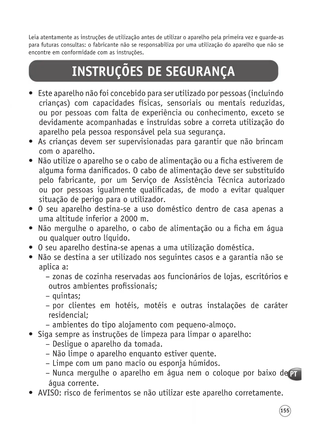 - Este aparelho não foi concebido para ser utilizado por pessoas (incluindo crianças) com capacidades físicas, sensoriais ou mentais reduzidas, ou por pessoas com falta de experiência ou conhecimento, exceto se devidamente acompanhadas e instruídas sobre a correta utilização do aparelho pela pessoa responsável pela sua segurança.