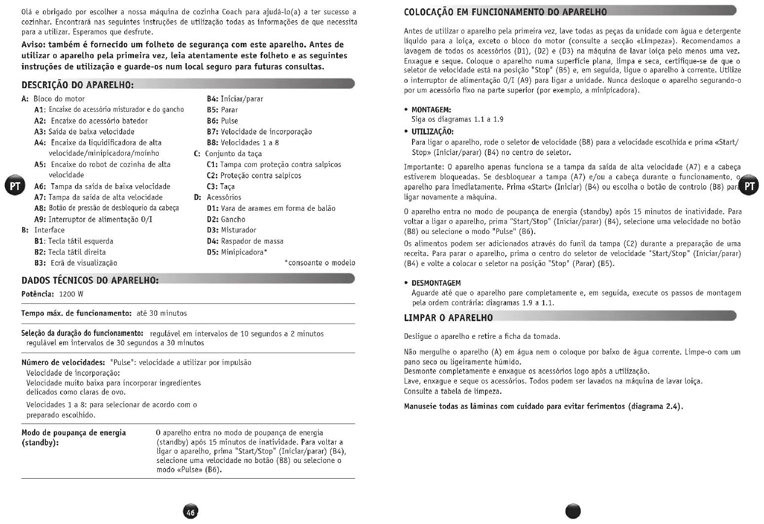 PTPT Olá e obrigado por escolher a nossa máquina de cozinha Coach para ajudá-lo(a) a ter sucesso a cozinhar. Encontrará nas seguintes instruções de utilização todas as informações de que necessita para a utilizar. Esperamos que desfrute. Aviso: também é fornecido um folheto de segurança com este aparelho. Antes de utilizar o aparelho pela primeira vez, leia atentamente este folheto e as seguintes instruções de utilização e guarde-os num local seguro para futuras consultas. DESCRIÇÃO DO APARELHO: A: Bloco do motor A1: Encaixe do acessório misturador e do gancho A2: Encaixe do acessório batedor A3: Saída de baixa velocidade A4: Encaixe da liquidificadora de alta velocidade/minipicadora/moinho A5: Encaixe do robot de cozinha de alta velocidade A6: Tampa da saída de baixa velocidade A7: Tampa da saída de alta velocidade A8: Botão de pressão de desbloqueio da cabeça A9: Interruptor de alimentação O/I B: Interface B1: Tecla tátil esquerda B2: Tecla tátil direita B3: Ecrã de visualização B4: Iniciar/parar B5: Parar B6: Pulse B7: Velocidade de incorporação B8: Velocidades 1 a 8 C: Conjunto da taça C1: Tampa com proteção contra salpicos C2: Proteção contra salpicos C3: Taça D: Acessórios D1: Vara de arames em forma de balão D2: Gancho D3: Misturador D4: Raspador de massa D5: Minipicadora* *consoante o modelo DADOS TÉCNICOS DO APARELHO: Potência: 1200 W Tempo máx. de funcionamento: até 30 minutos Seleção da duração do funcionamento: regulável em intervalos de 10 segundos a 2 minutos regulável em intervalos de 30 segundos a 30 minutos Número de velocidades: "Pulse": velocidade a utilizar por impulsão Velocidade de incorporação: Velocidade muito baixa para incorporar ingredientes delicados como claras de ovo. Velocidades 1 a 8: para selecionar de acordo com o preparado escolhido. Modo de poupança de energia O aparelho entra no modo de poupança de energia (standby) após 15 minutos de inatividade. Para voltar a ligar o aparelho, prima "Start/Stop" (Iniciar/parar) (B4), selecione uma velocidade no botão (B8) ou selecione o modo «Pulse» (B6).